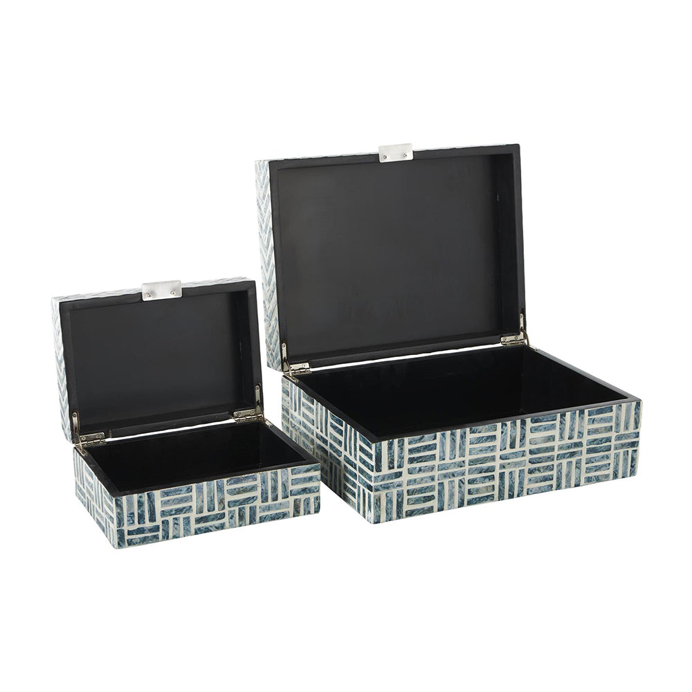 El Set 2 Alhajero Mosaico es una pieza de lujo artesanal que fusiona diseño moderno con materiales sofisticados. Su acabado en mosaico de nácar, con tonos azules brillantes y destellos naturales, aporta frescura y elegancia a cualquier espacio. Perfectas para quienes buscan un acento decorativo audaz y minimalista, estas cajas destacan por su estética geométrica y refinada.