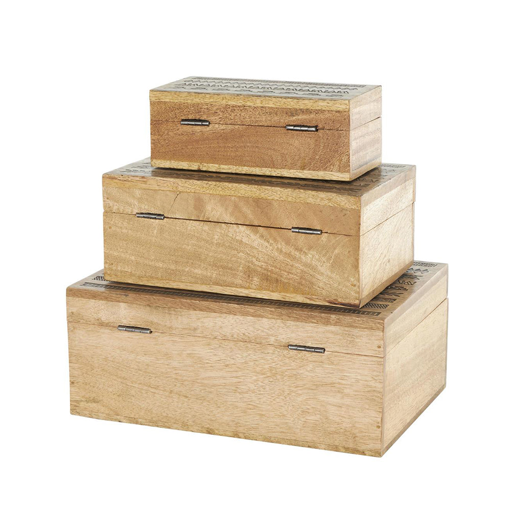 El acabado marrón mate resalta la veta natural de la madera, mientras los relieves dorados aportan un toque de lujo sutil que dialoga con estilos clásicos, étnicos o contemporáneos. Su elaboración del Set 3 Alhajero Tribal garantiza una pieza duradera, auténtica y con un carácter único: cada caja es ligeramente distinta, como una pequeña obra de arte.