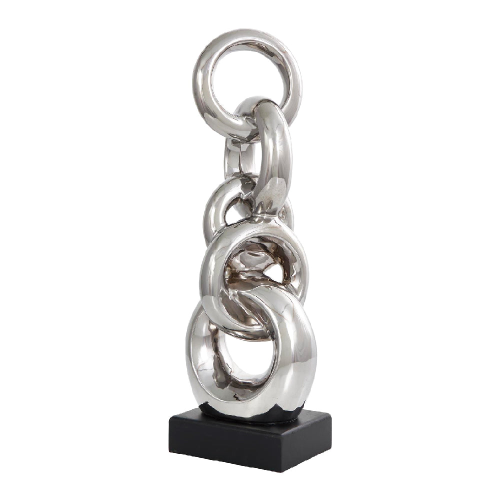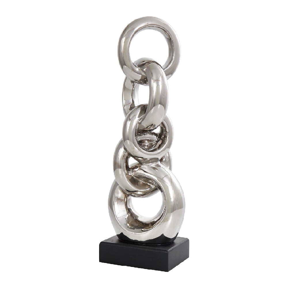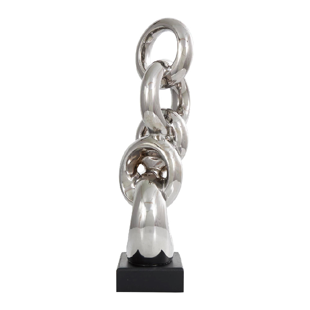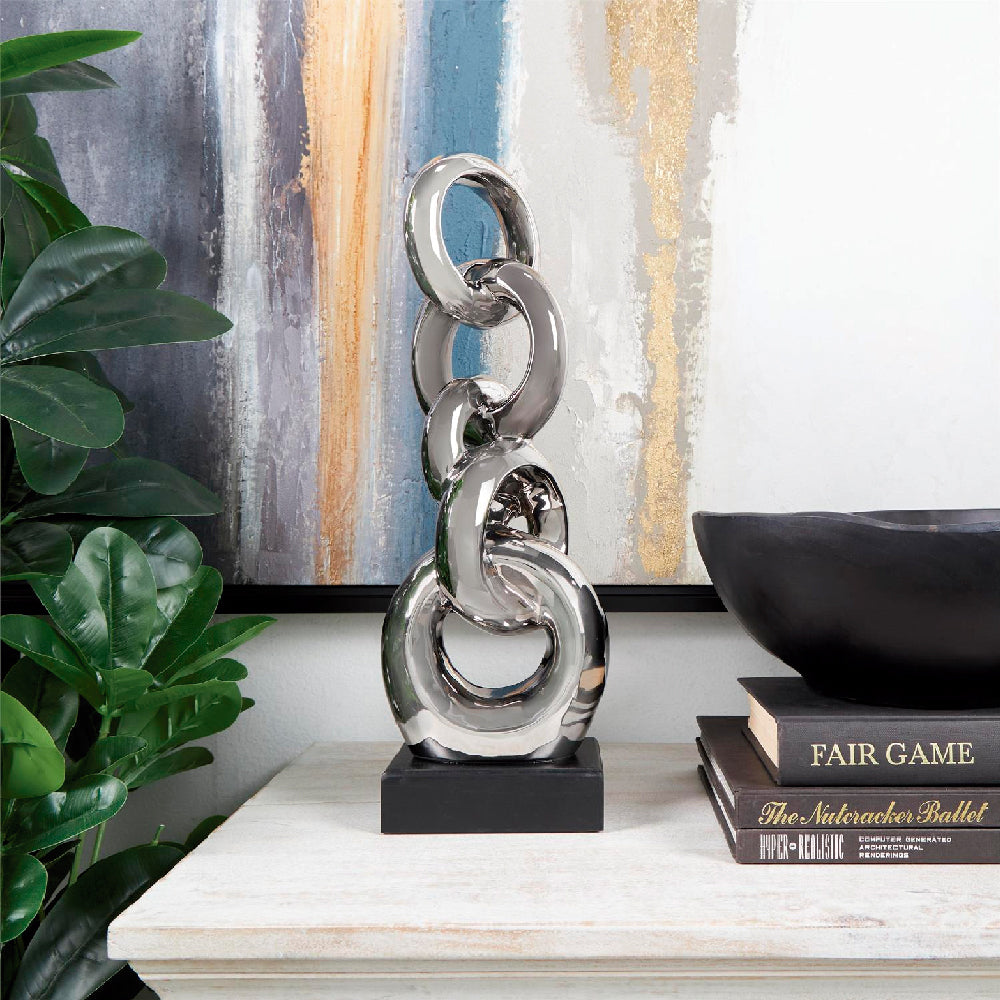 Esta Escultura Geométrica en acabado plateado es una pieza ideal para complementar interiores contemporáneos y minimalistas. Su silueta vertical formada por eslabones redondos crea un efecto visual dinámico que aporta movimiento y sofisticación a repisas, consolas o mesas de acento. El brillo metálico refleja la luz de manera elegante, generando un contraste moderno que armoniza con paletas neutras, negros profundos o maderas naturales