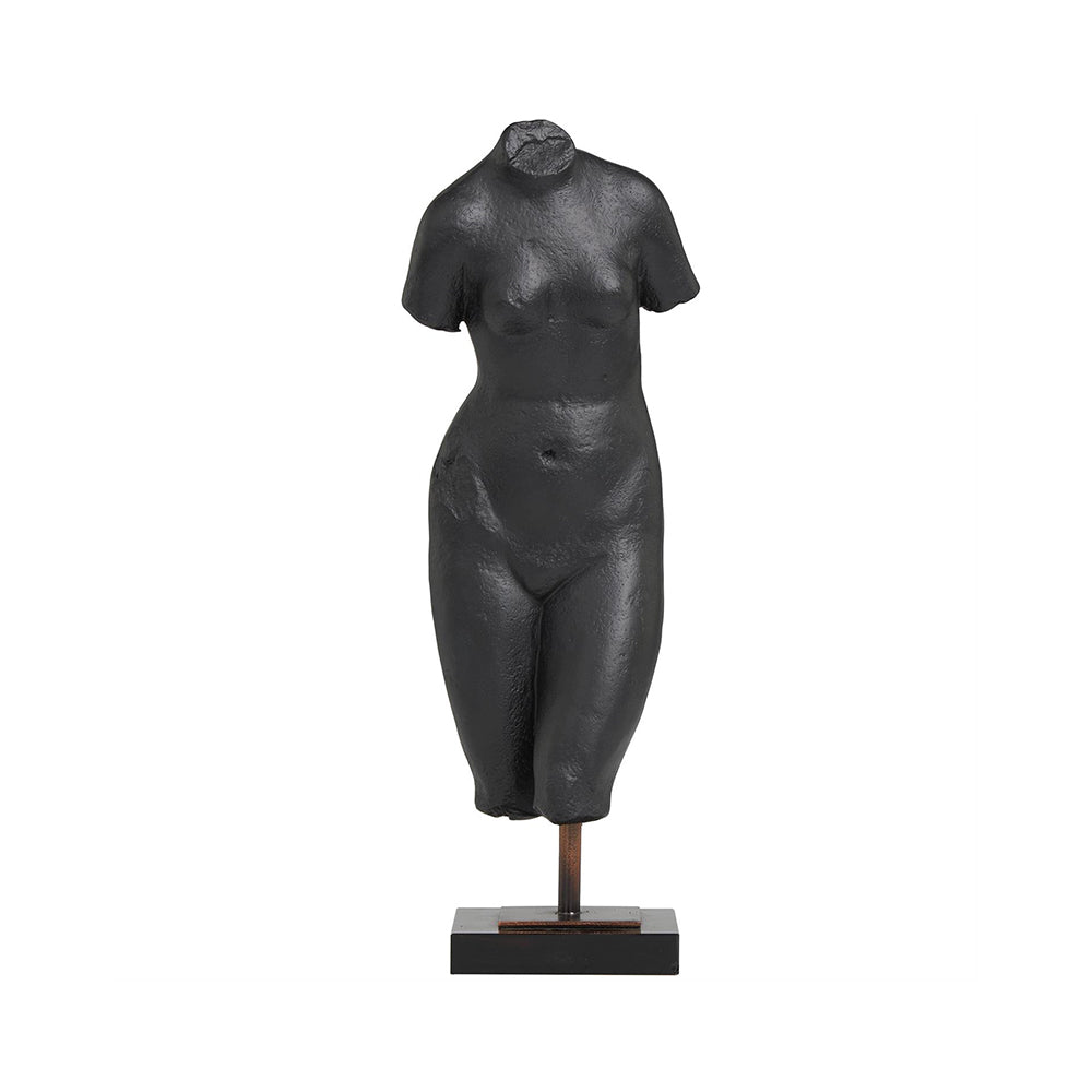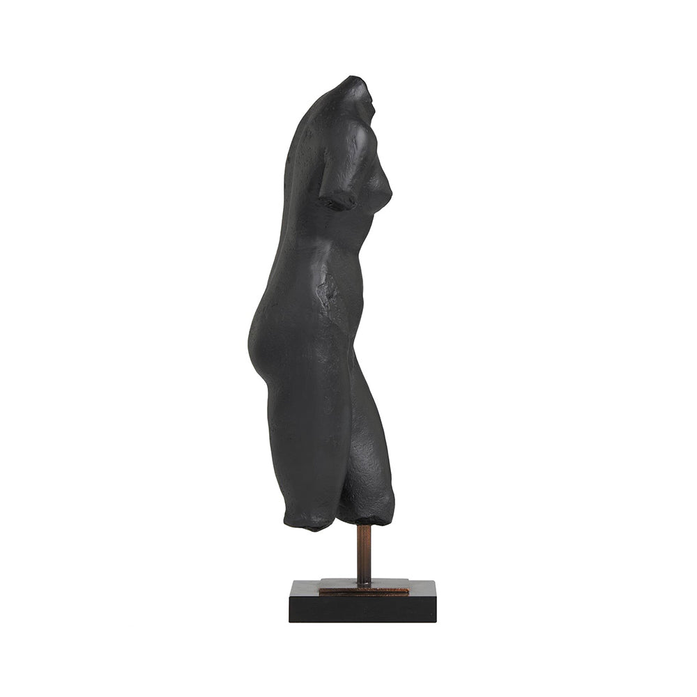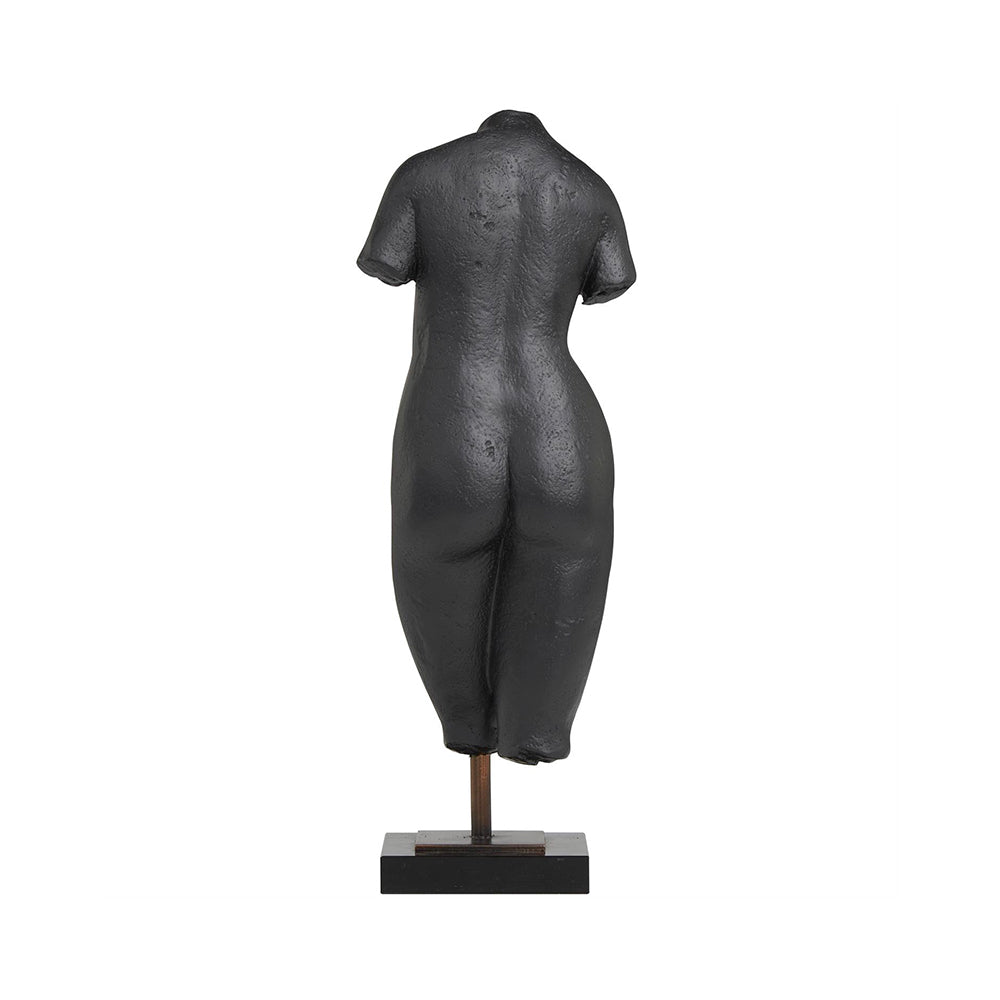 Esta Escultura Mujer aporta una presencia artística y sofisticada a cualquier espacio interior. Su acabado negro mate y su silueta abstracta evocan piezas clásicas reinterpretadas en clave moderna, lo que la convierte en un acento ideal para interiores minimalistas, contemporáneos o de inspiración artística. La textura sutil de la pieza añade profundidad visual, creando un contraste elegante cuando se coloca sobre repisas, consolas, mesas laterales o vitrinas.