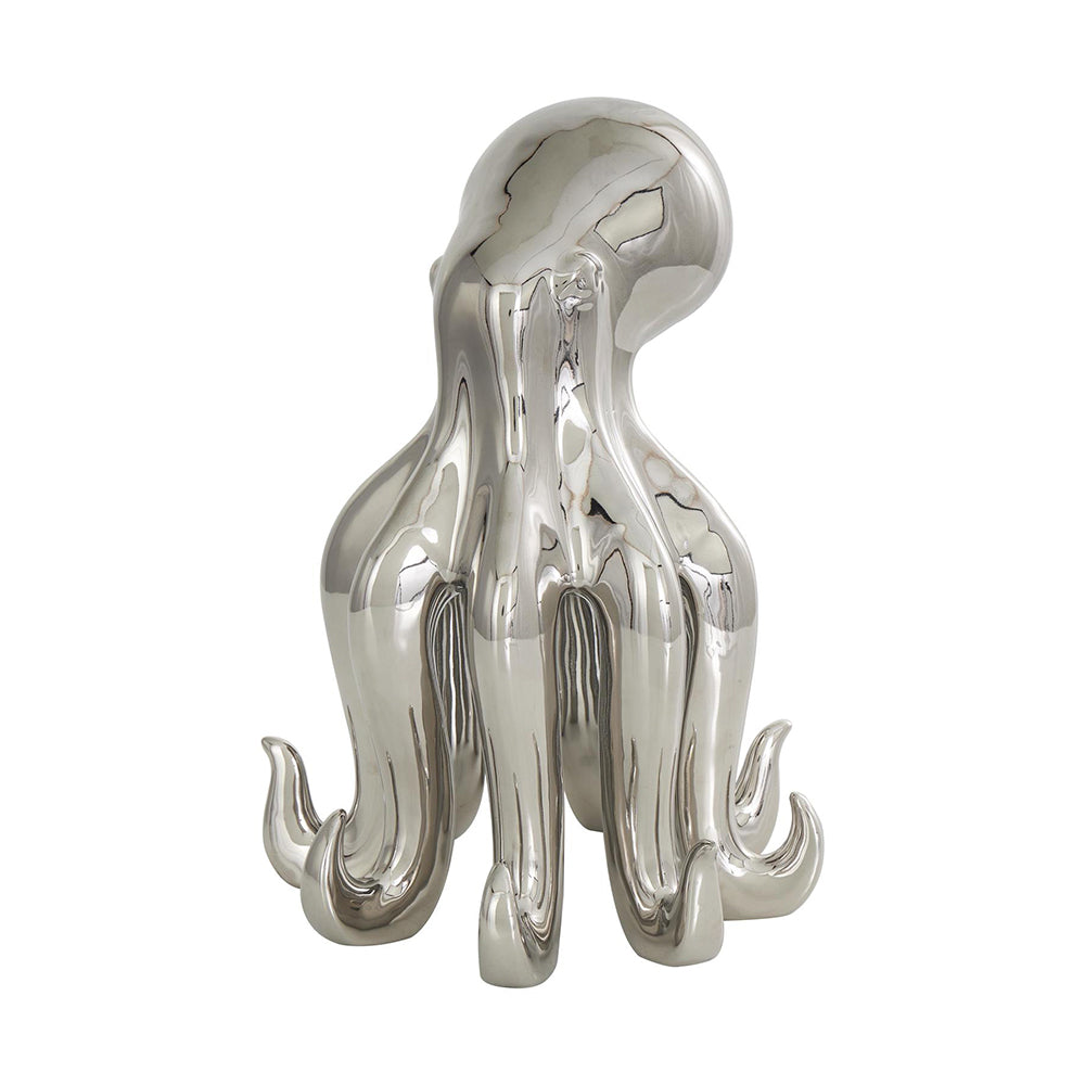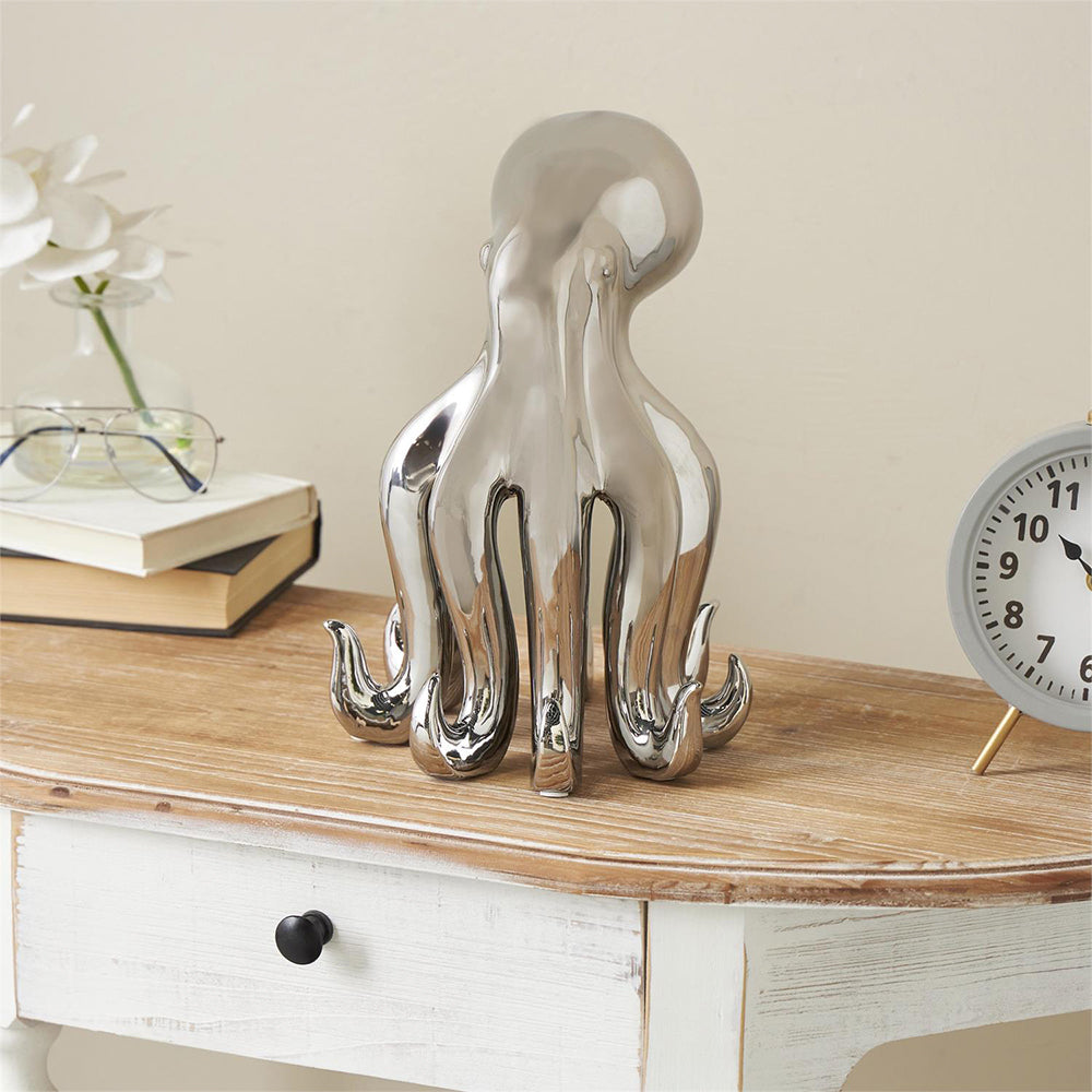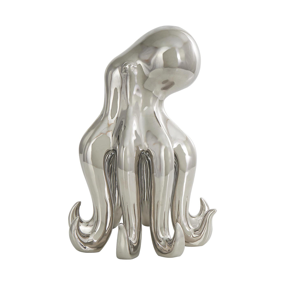 Esta Escultura Pulpo acabado plateado aporta un toque artístico y contemporáneo inspirado en la serenidad del mar. Su forma asimétrica y dinámica crea un efecto visual elegante, ideal para interiores que buscan una pieza llamativa sin perder armonía. El brillo metálico de la cerámica refleja la luz de manera sofisticada, convirtiéndola en un acento perfecto para consolas, repisas, mesas laterales o vitrinas con temática costera, moderna o ecléctica.