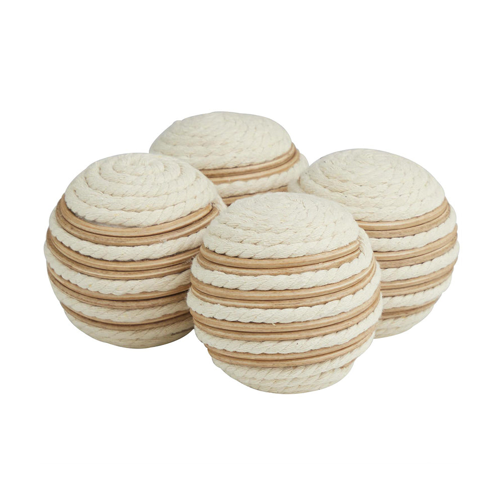 Los orbes redondos presentan un acabado texturizado que realza su patrón lineal, aportando un toque artesanal y orgánico que complementa cualquier decoración. Perfectos para combinar con jarrones, estanterías o centros de mesa, este Set 4 Esferas Yute ofrecen un equilibrio de simplicidad y sofisticación natural.