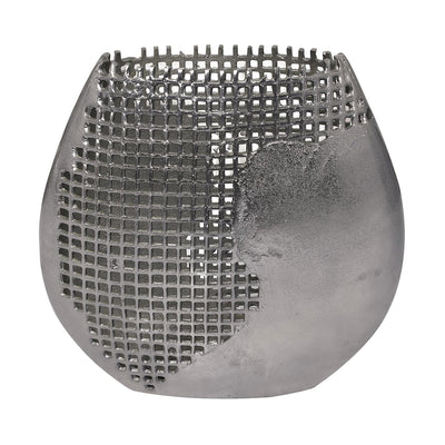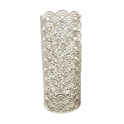Jarrón Calado, acabado dorado envejecido, estructura metálica calada, tipo filigrana, jarrón para recibidores, salas o consolas contemporáneas, estilos glam, minimalistas o clásicos con un giro moderno.