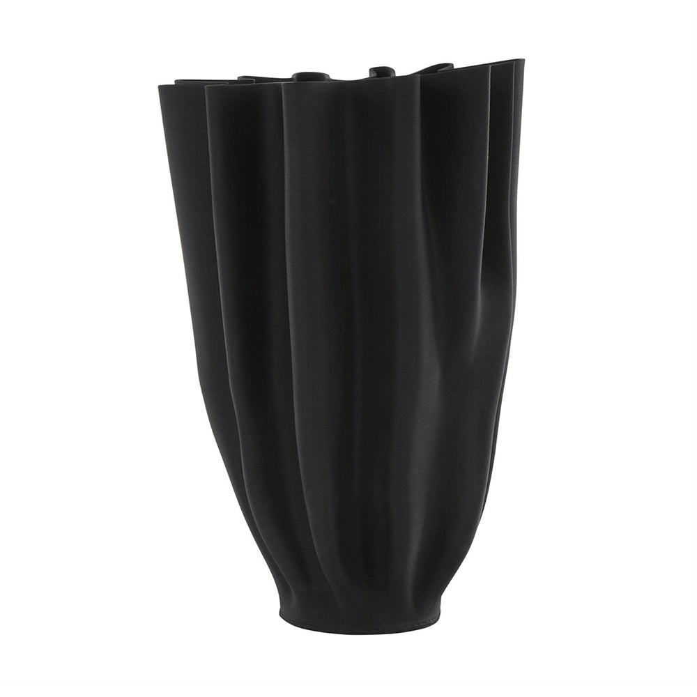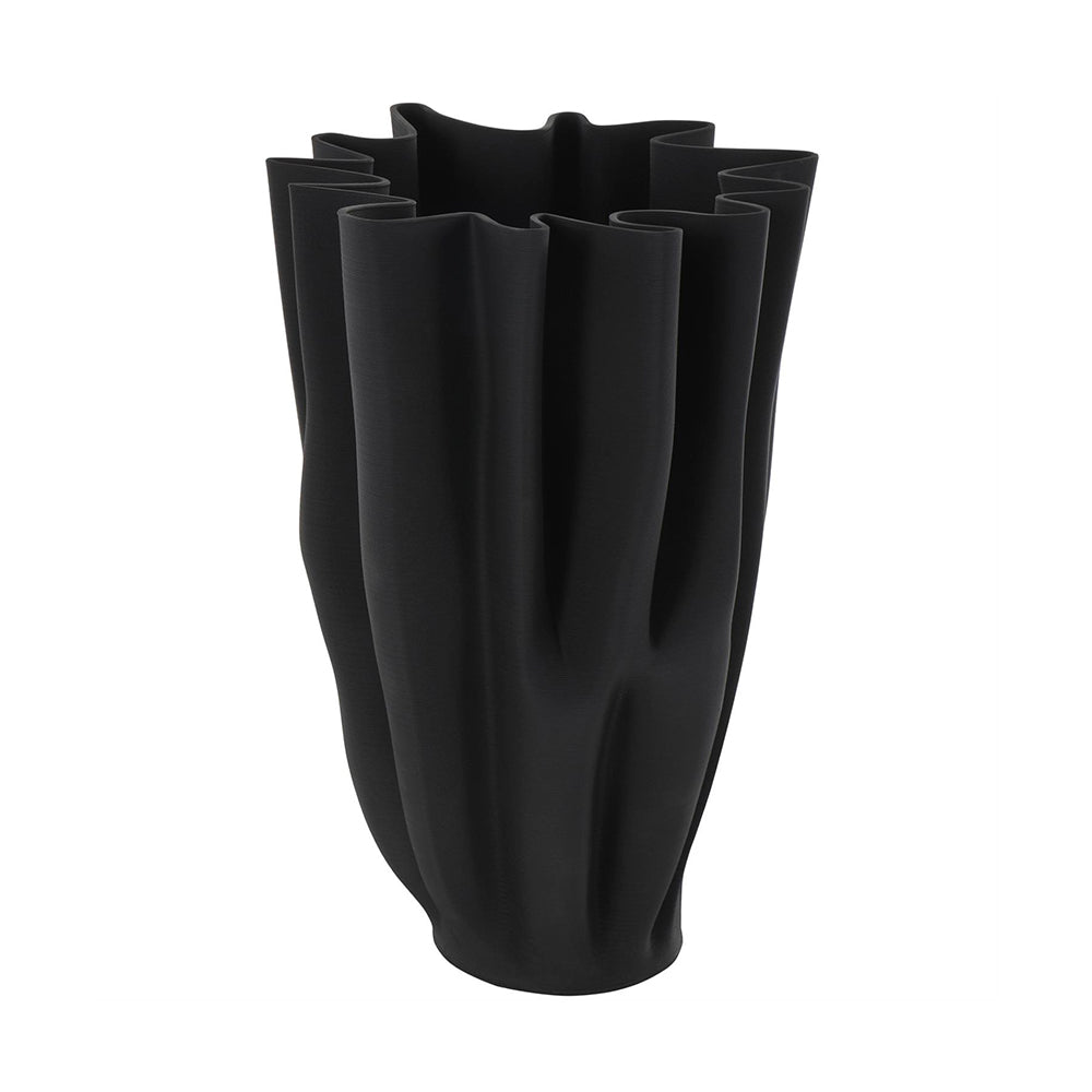 El Jarrón Ondulado Floral es una pieza contemporánea que combina diseño escultórico y minimalismo elegante. Su acabado texturizado en negro mate con patrón acanalado aporta profundidad visual y carácter, mientras que el borde angular inspirado en los tulipanes lo convierte en un accesorio único que realza la decoración de interiores modernos, minimalistas y sofisticados.