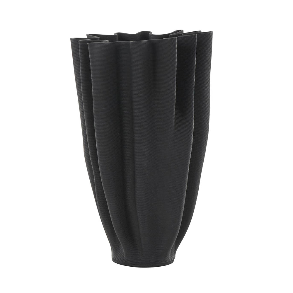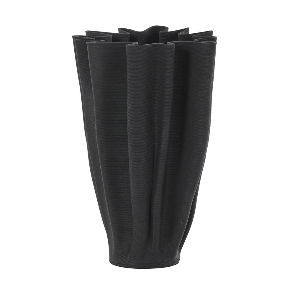 El Jarrón Ondulado Negro es una pieza contemporánea que fusiona diseño escultórico y elegancia minimalista. Su acabado texturizado en negro mate con patrón acanalado crea un efecto dinámico que aporta profundidad visual, mientras que su borde floral inspirado en tulipanes añade un detalle artístico único.