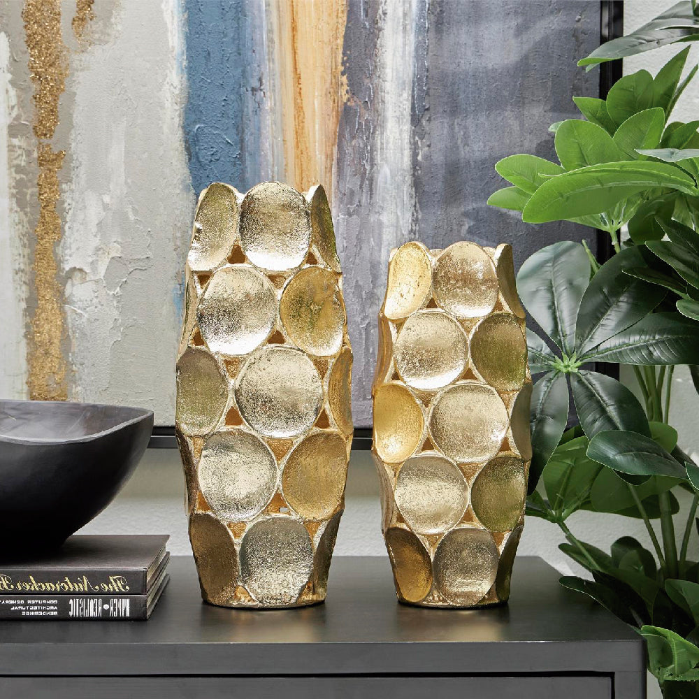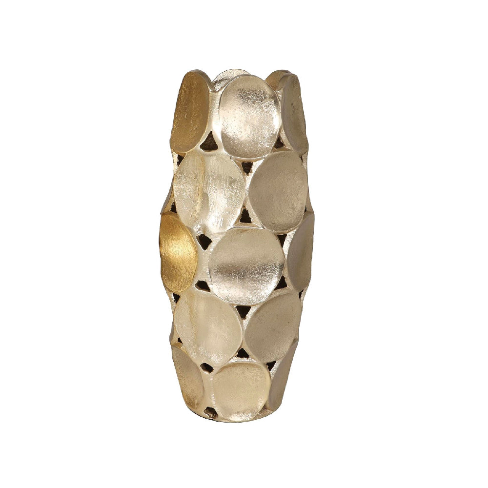 Este Jarrón Platos combina diseño escultórico y estilo contemporáneo en una pieza llena de carácter. Su estructura asimétrica con marcos geométricos abiertos y placas circulares crea un efecto visual moderno y sofisticado, ideal para realzar mesas auxiliares, repisas o consolas. El acabado en metal dorado satinado aporta brillo sutil y elegancia, integrándose fácilmente en interiores minimalistas, modernos o de lujo discreto.