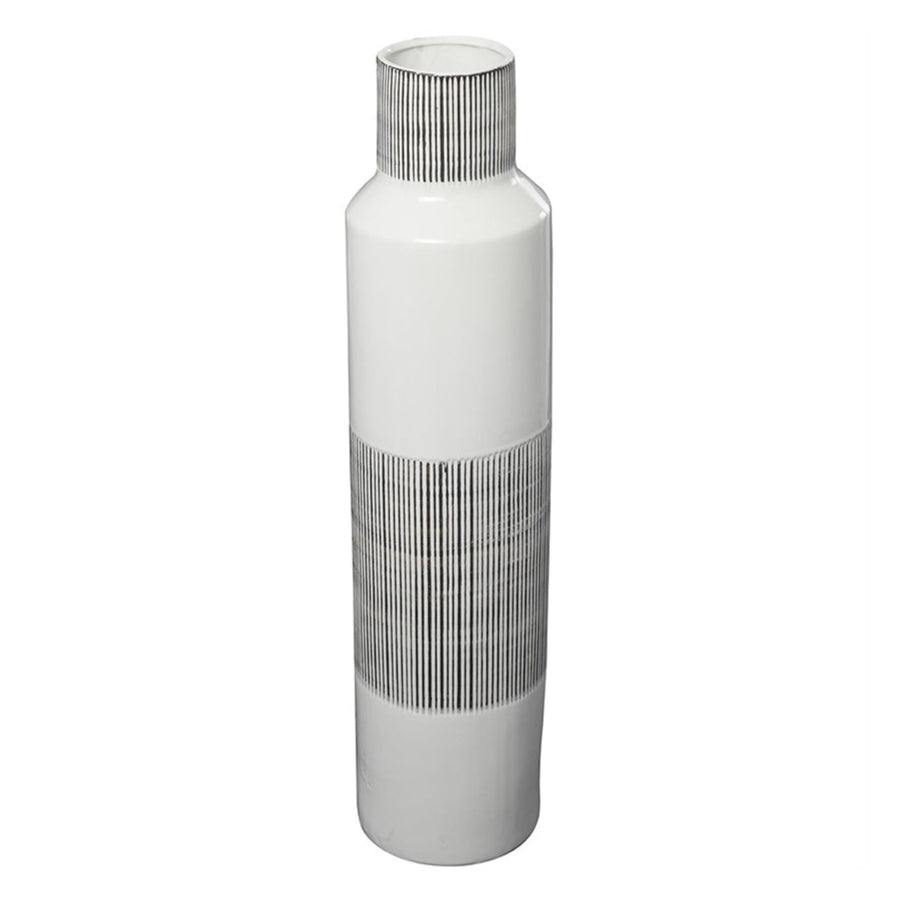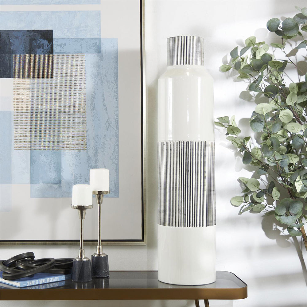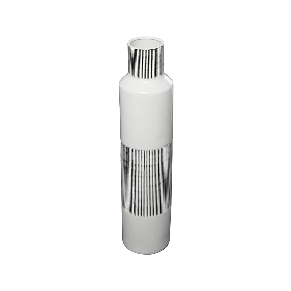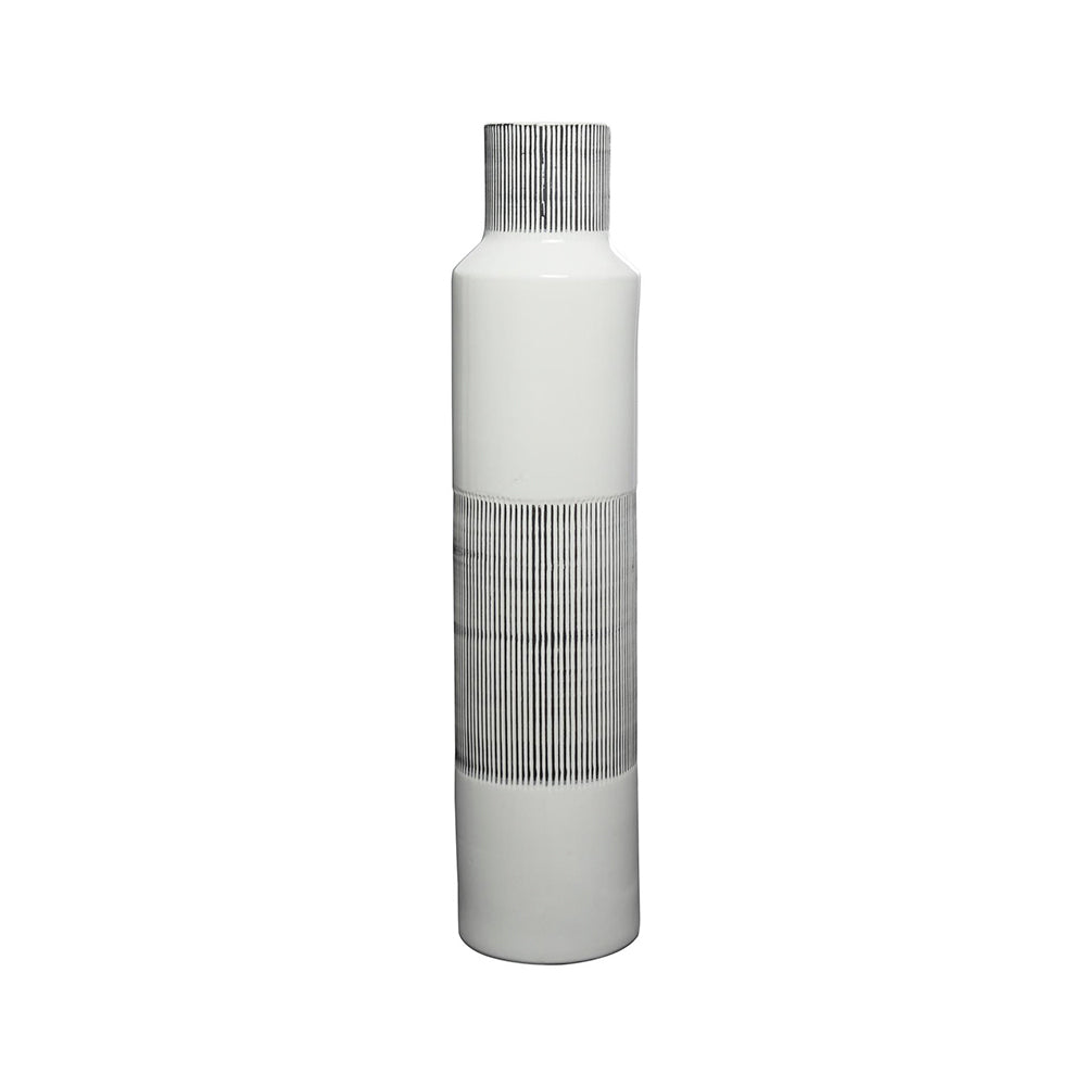 El Jarrón Rayas  es una pieza artesanal que combina diseño minimalista y elegancia contemporánea, ideal para transformar cualquier espacio interior. Su acabado blanco pulido se complementa con sutiles rayas verticales grises, generando un contraste moderno que aporta sofisticación y frescura al ambiente.