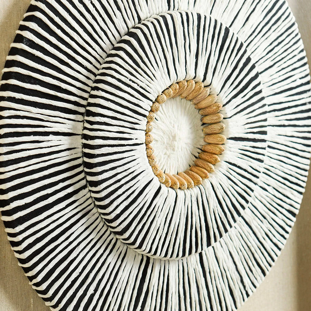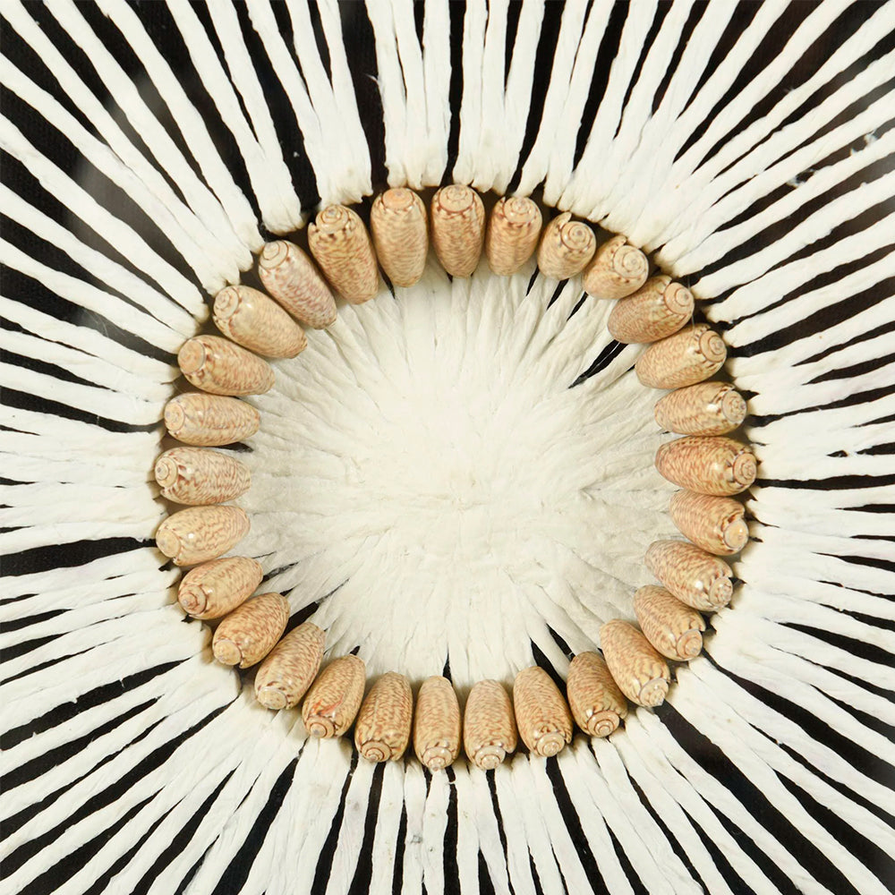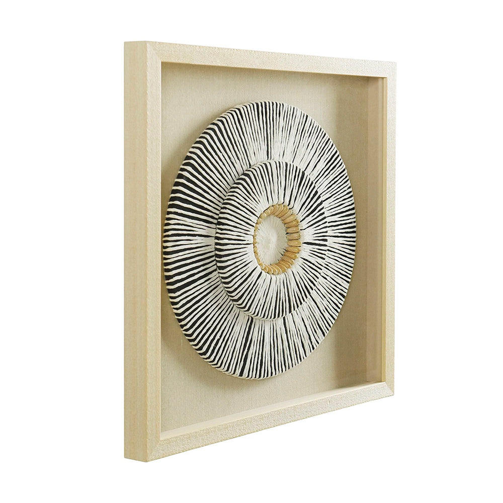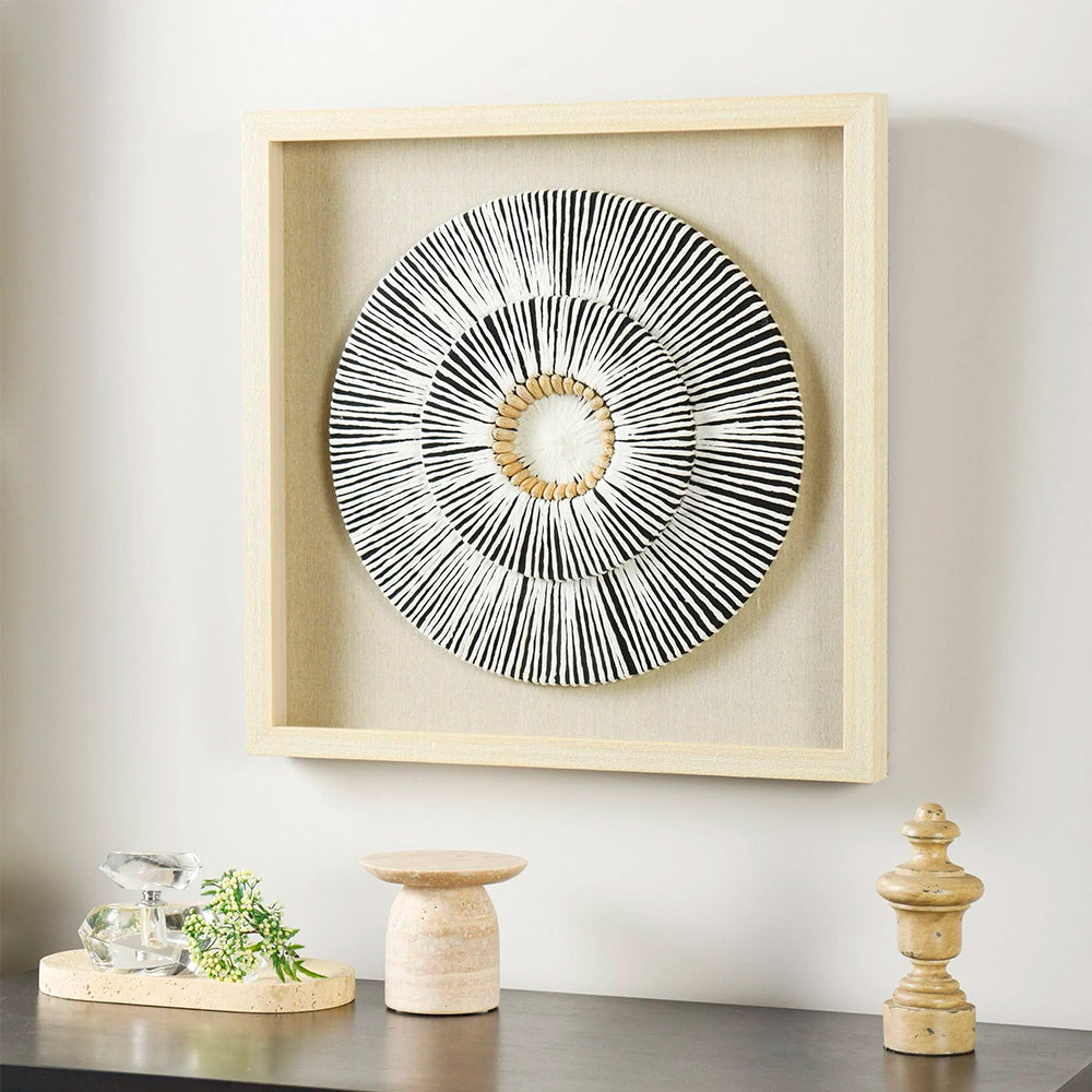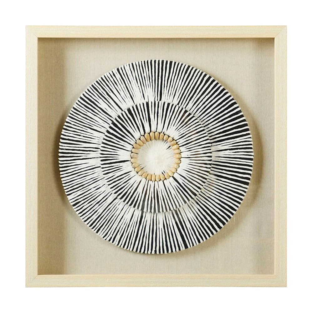 El Cuadro Círculo Dimensional es una pieza artística tridimensional que combina elementos naturales y diseño contemporáneo. Presentado en una caja de sombras de madera clara, este arte dimensional muestra un disco central en patrones radiales en blanco y negro, con un delicado anillo de conchas marinas en el centro.