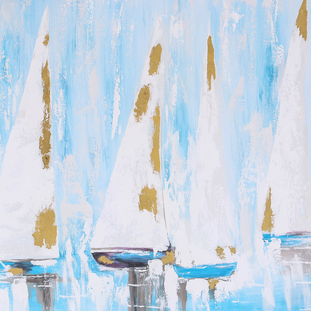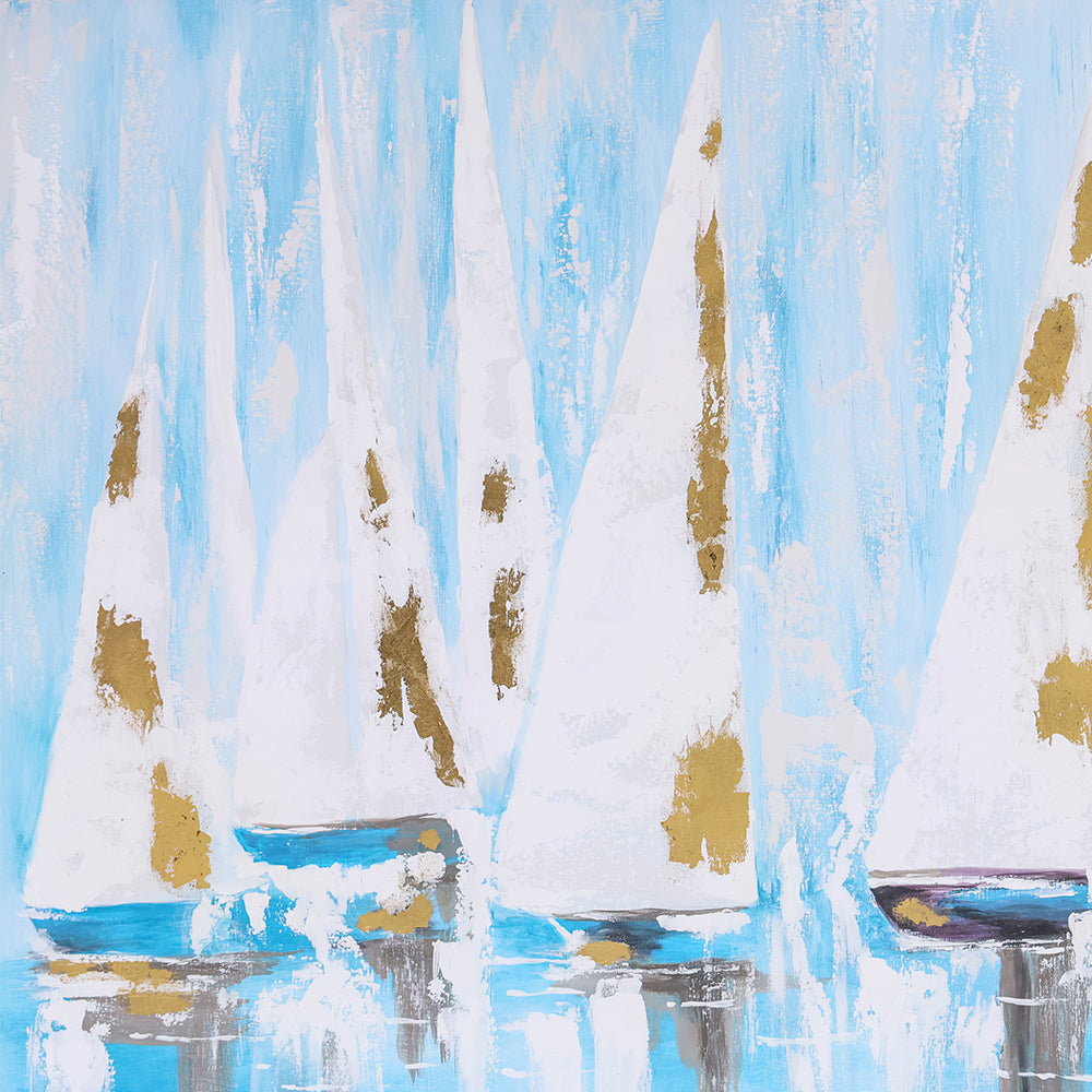 Este Cuadro Costero de gran formato presenta una escena serena de veleros en tonos azulados que evocan tranquilidad, libertad y frescura. La composición transmite movimiento suave y calma visual, ideal para ambientar espacios con inspiración marina o costera contemporánea.