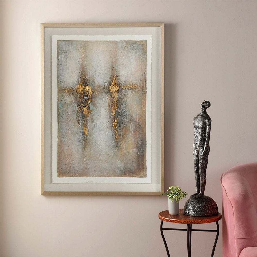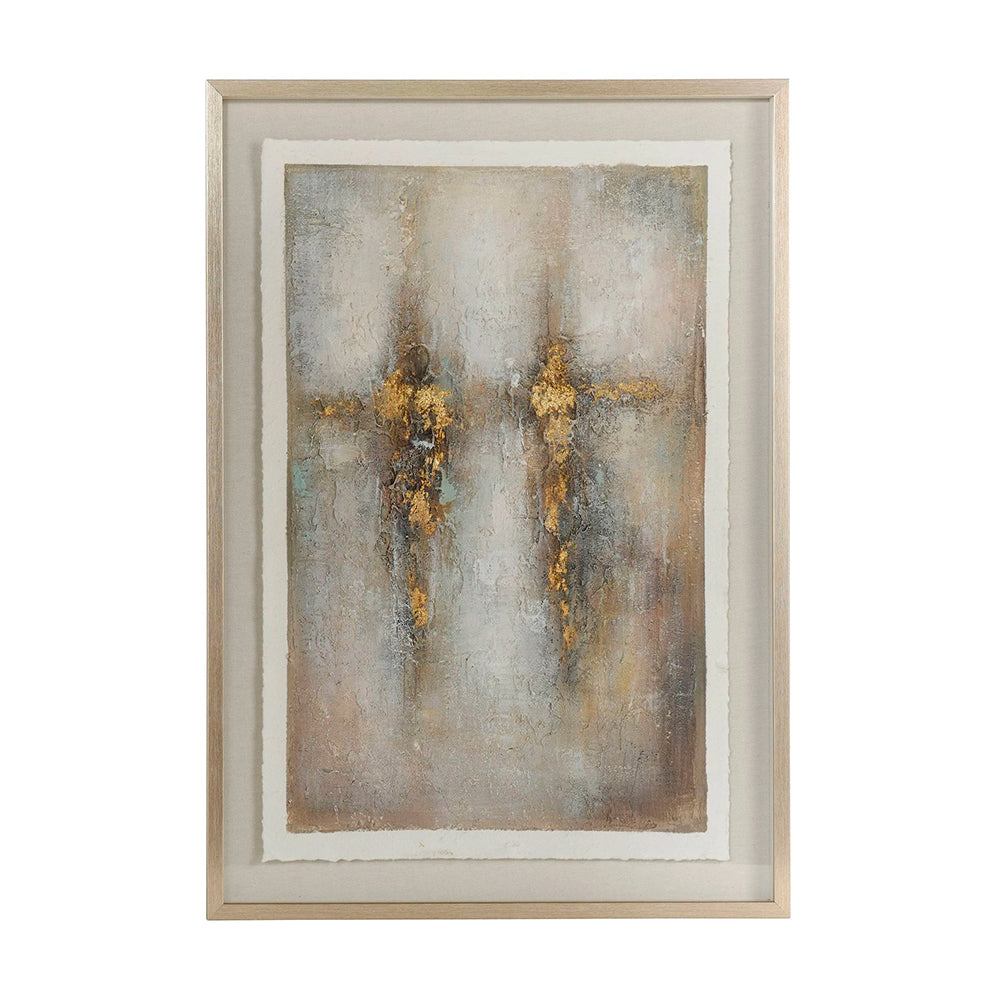 Este Cuadro Sombra Dorada destaca por su impactante trabajo en relieve y la riqueza de texturas que combinan tonos neutros con acentos dorados. La composición abstracta sugiere figuras etéreas que parecen emerger de un fondo difuminado, evocando movimiento y profundidad. Su acabado artesanal y la aplicación de dorado metálico aportan luminosidad y un toque sofisticado que eleva cualquier espacio.