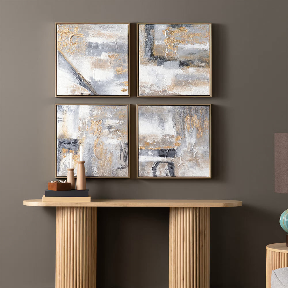 El marco dorado de líneas limpias refuerza el contraste entre los tonos neutros y los detalles metálicos, logrando un acabado pulido que dialoga perfectamente con estilos modernos, transicionales y minimalistas de lujo. El formato cuadrado del Políptico Mineral permite una instalación versátil, ideal para composiciones simétricas que aportan orden, ritmo y un impacto visual refinado.