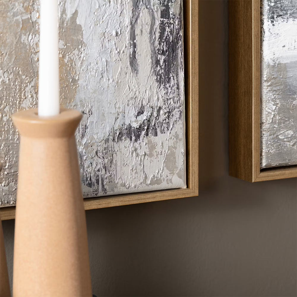 Este Políptico Mineral aporta carácter y sofisticación a los interiores contemporáneos, combinando capas de grises, blancos y negros con acentos dorados que capturan la luz y generan profundidad visual. La composición de cada pieza funciona tanto de forma individual como en conjunto, creando una narrativa artística equilibrada que eleva muros principales en salas, comedores o recibidores con una presencia elegante y actual.