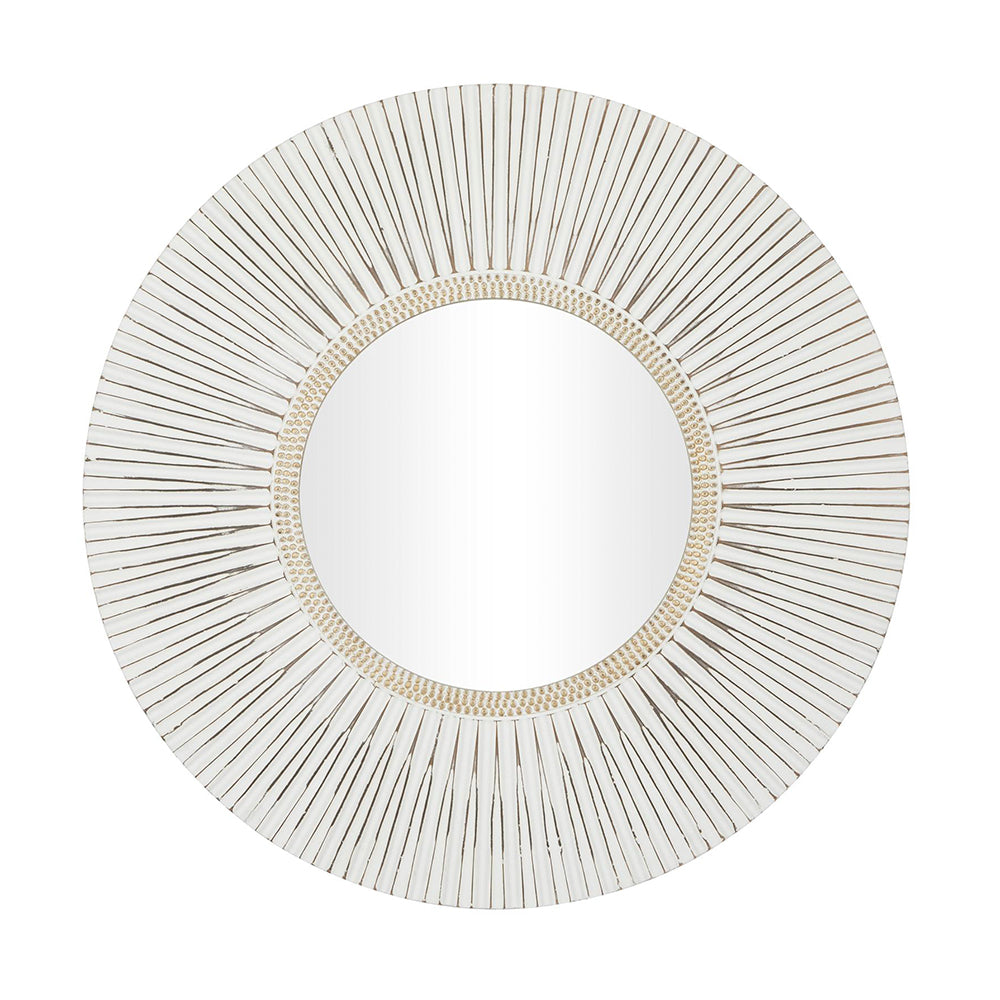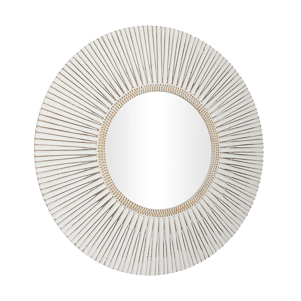 Este Espejo Celeste irradia un espíritu libre y vibrante, ideal para quienes buscan un toque bohemio en su decoración. Su marco blanco desgastado, combinado con detalles dorados y un círculo interior de cuentas, crea un efecto visual intrigante que añade carácter y dinamismo a cualquier habitación.