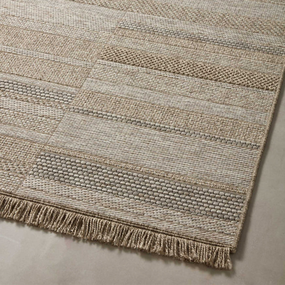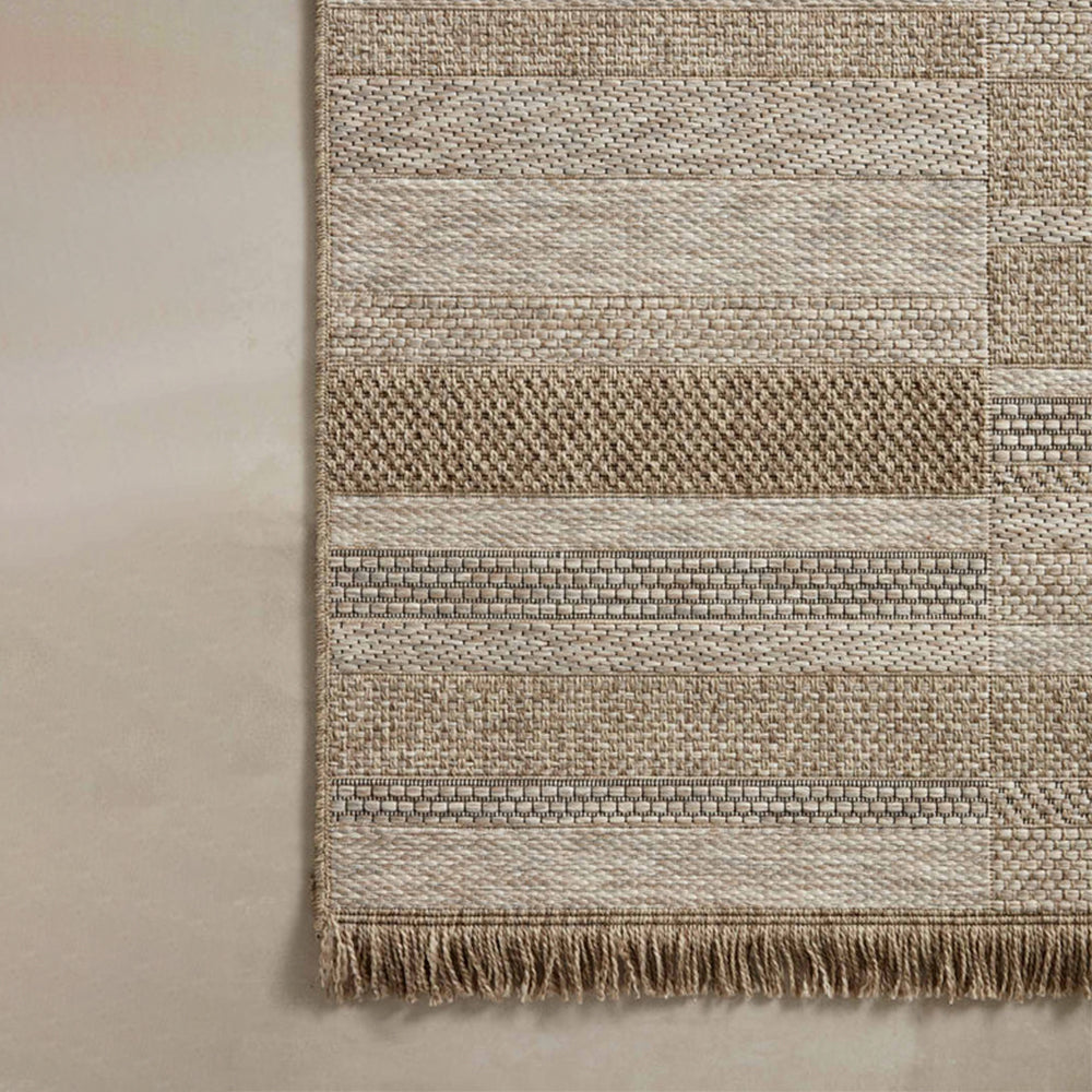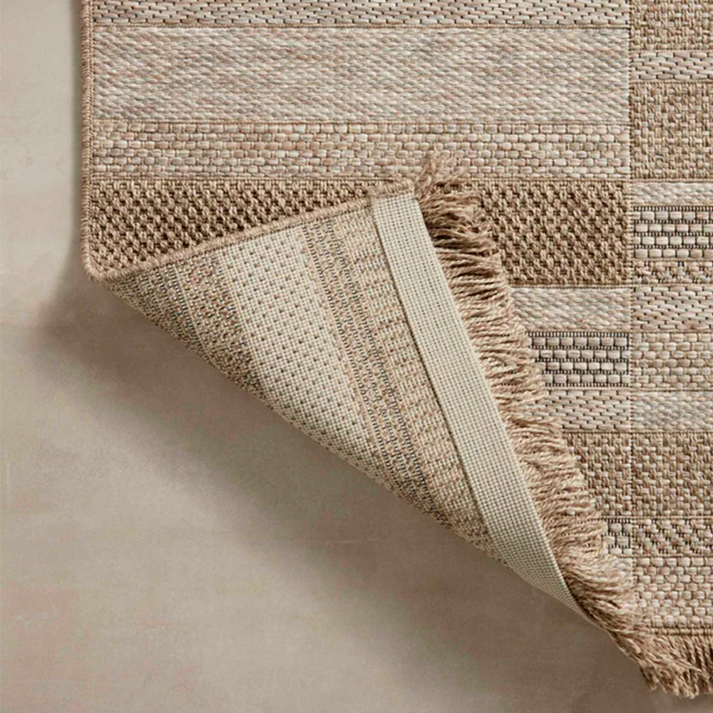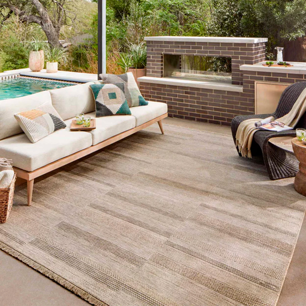 La Tapete Arena es la elección perfecta para quienes buscan equilibrio entre diseño y funcionalidad. Su patrón en tonos arena, beige y marrón evoca la serenidad del Mediterráneo y transforma cualquier terraza, jardín o sala exterior en un espacio acogedor y elegante. Su textura plana y sus sutiles franjas aportan profundidad visual, ideal para quienes aman los ambientes naturales con un toque contemporáneo.