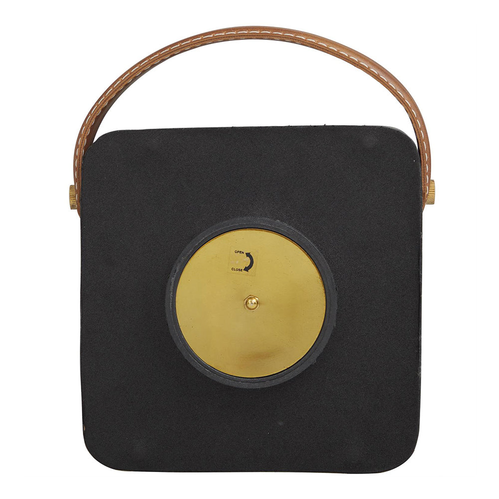 La Decoración Reloj Metálico esta fabricado con metal, MDF, plástico, cuero sintético y vidrio, el color negro presenta un acabado mate que resalta su silueta moderna. Su cuerpo cuadrado descansa sobre pequeñas patas, mientras que el mango curvado en cuero sintético con costuras expuestas añade un toque distintivo.