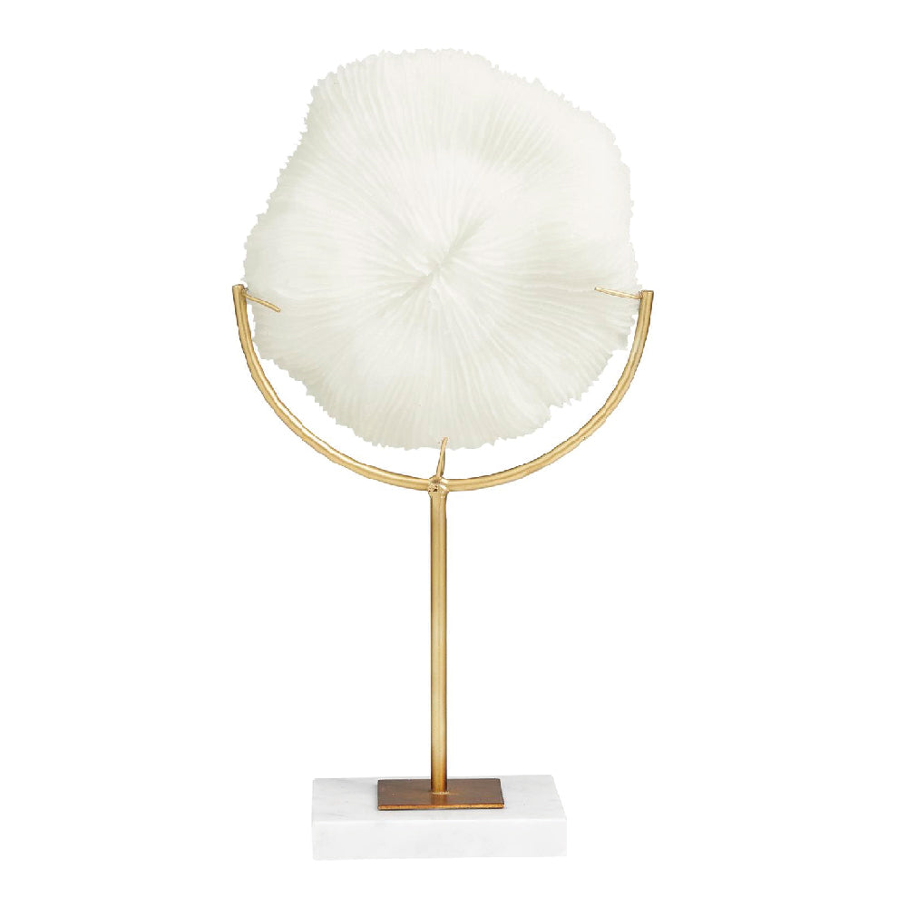 El soporte metálico con acabado dorado satinado y la base de mármol blanco de la  Escultura Coral elevan la pieza tanto literal como estéticamente, aportando contraste y sofisticación. Esta mezcla de materiales añade balance entre lo orgánico y lo moderno, convirtiéndola en una pieza perfecta para destacar dentro de una composición decorativa. Su silueta vertical hace que funcione tanto como punto focal como complemento dentro de una colección de acentos costeros.