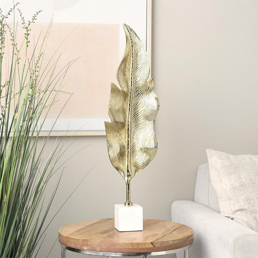 Montada sobre una sólida base cuadrada de mármol blanco, esta Escultura Hoja Dorada logra un contraste visual atractivo entre lo orgánico y lo moderno. Ideal para salas, comedores, entradas u oficinas, se convierte en un acento protagonista que transmite distinción y estilo. Su estética glamorosa y atemporal la hace perfecta para interiores contemporáneos, sofisticados y llenos de carácter.