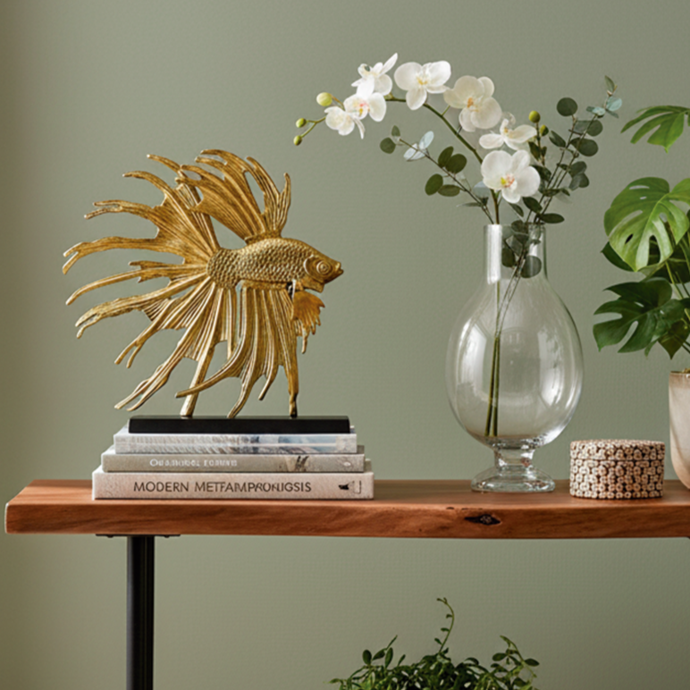 La Escultura Pez León presenta un diseño detallado y acabado metálico dorado, elaborado en aluminio de alta calidad. Sus aletas estilizadas y ondulantes capturan el movimiento elegante del pez, mientras que el montaje sobre una base negra sólida crea un contraste visual que realza la pieza. El acabado en tono champán oscuro aporta sofisticación y un toque lujoso, ideal para interiores contemporáneos o con inspiración náutica.