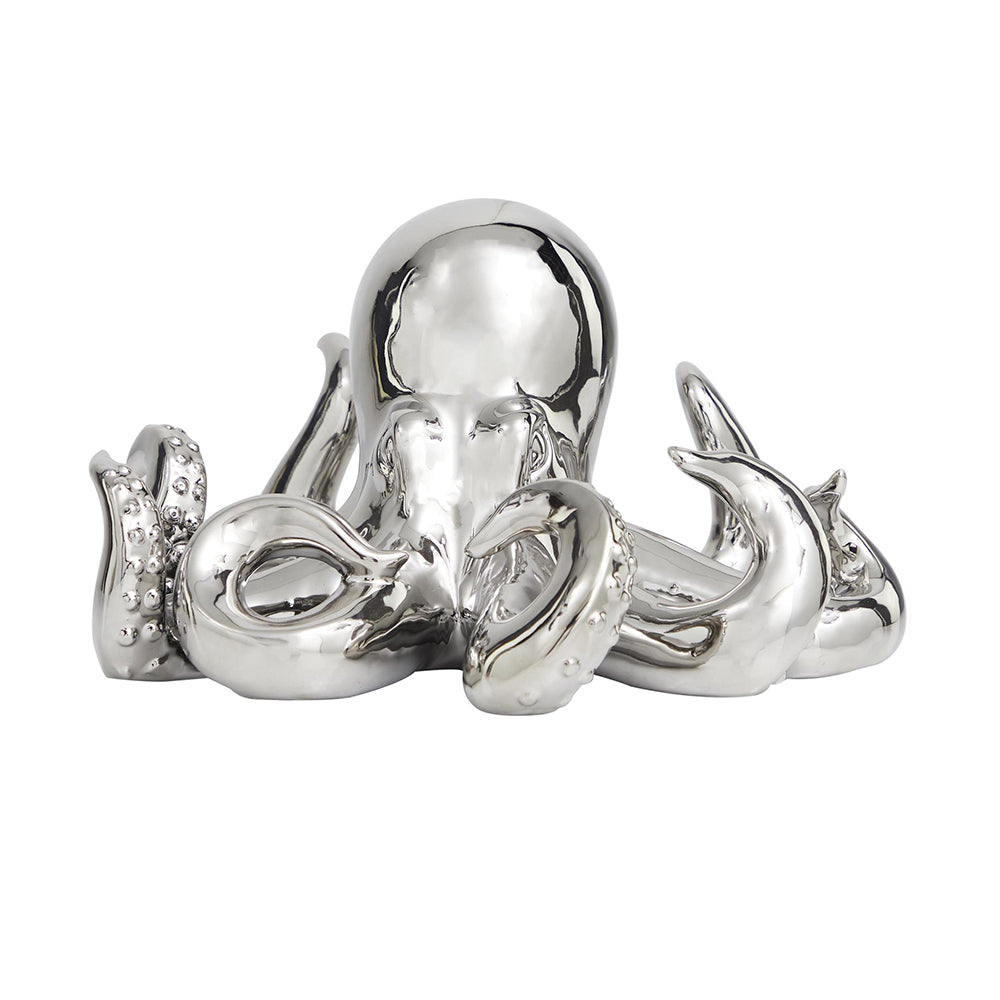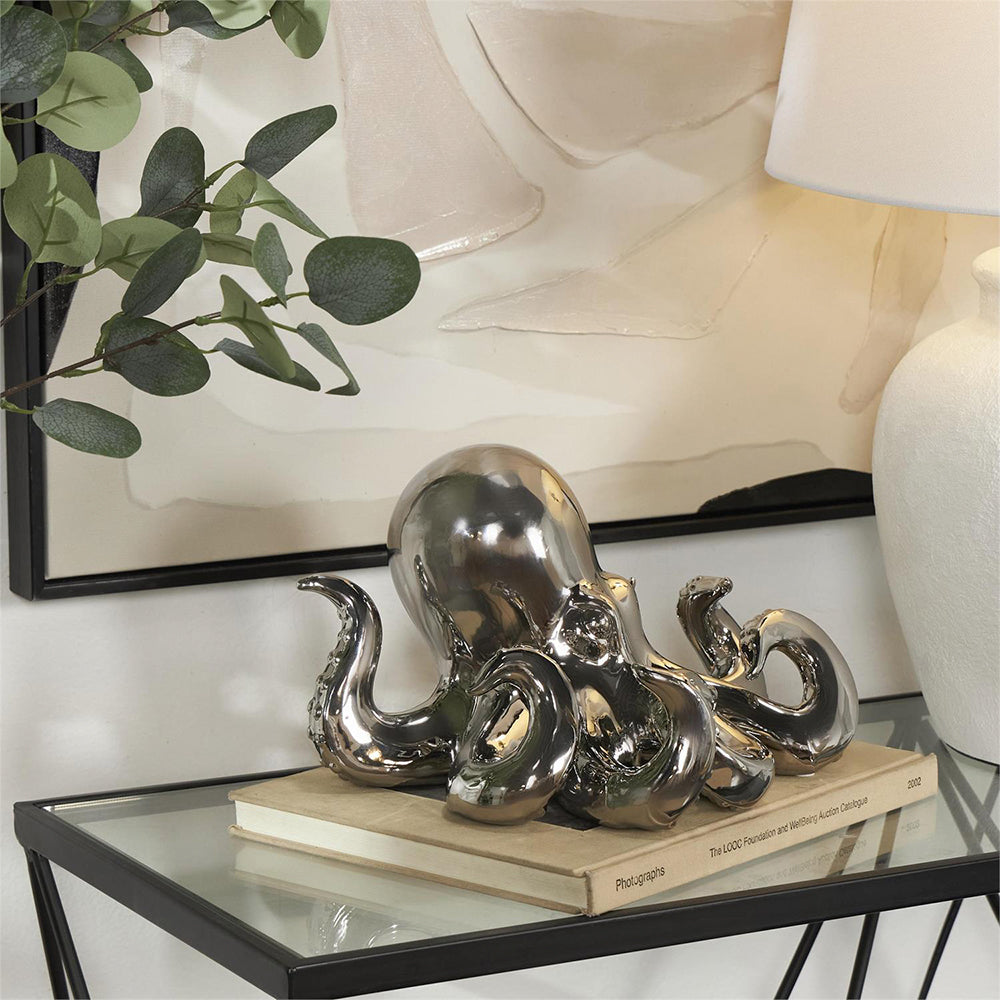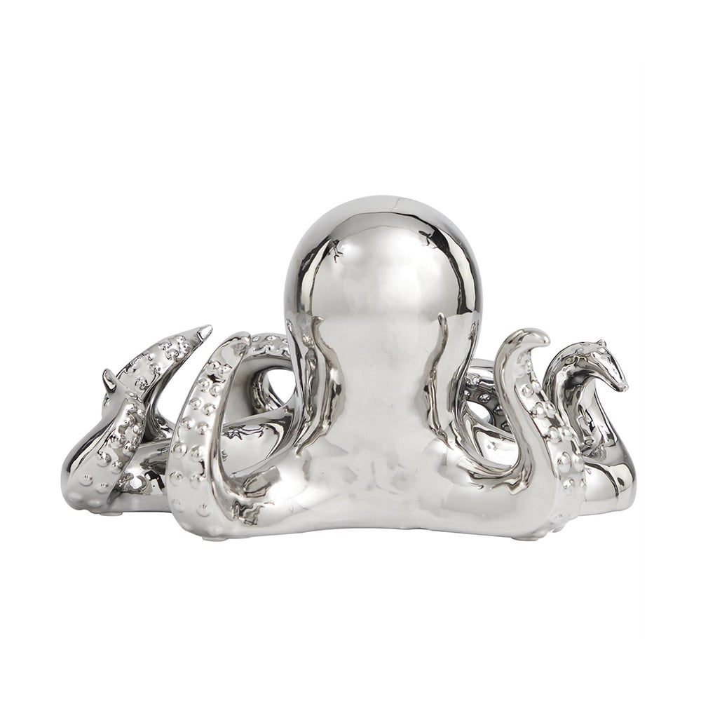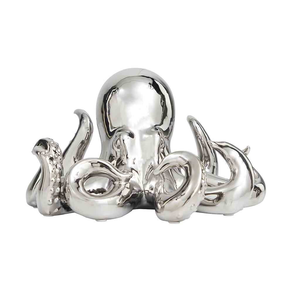 Inspirada en la fuerza y misterio del océano, esta Escultura Pulpo Plateado se convierte en un acento decorativo lleno de personalidad. Su diseño detallado con tentáculos en movimiento y ventosas esculpidas transmite dinamismo y realismo, logrando que cada ángulo sea una pequeña obra de arte.