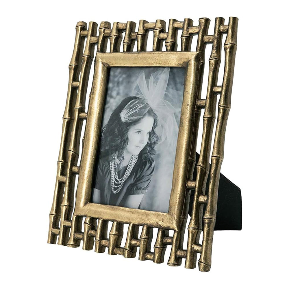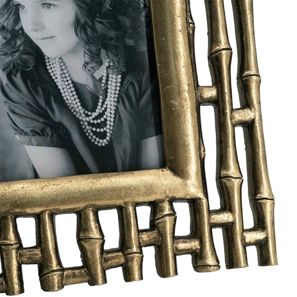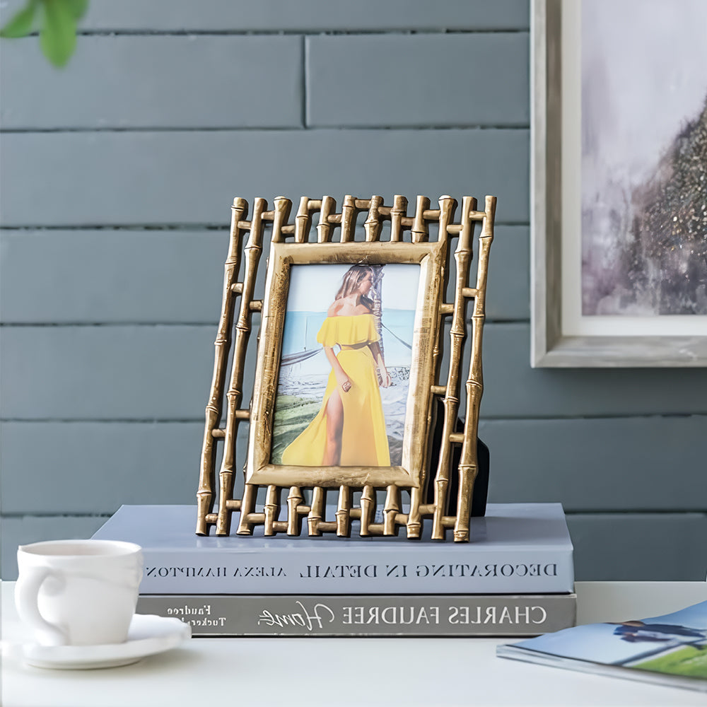 Portarretrato Bambú Dorado, forma orgánica del bambú, acabado metálico, tono dorado envejecido, estilo contemporáneo, ecléctico o incluso tropical chic, texturas, formas irregulares, bambú tallado, artesanal, exótico.