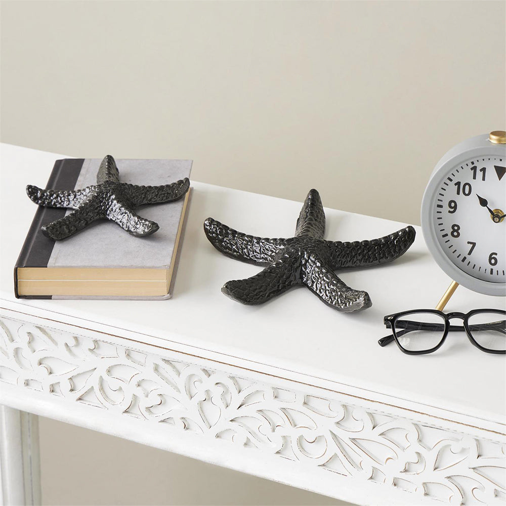 Inspirado en la serenidad del mar y las texturas naturales de la costa, este Set 2 Escultura Estrella de Mar aporta un toque contemporáneo y sofisticado a cualquier espacio. Elaboradas en aluminio duradero con un acabado negro brillante, estas piezas destacan por su diseño asimétrico y elegante, capturando la esencia de las estrellas de mar con un detalle meticuloso en cada brazo. Perfectas para estanterías, mesas auxiliares o consolas, infunden carácter y un aire moderno con un guiño al encanto marítimo.