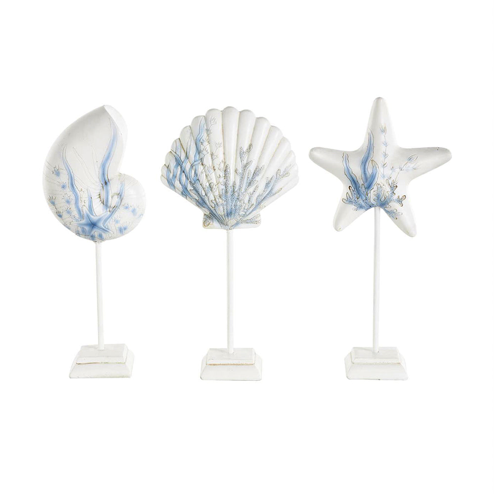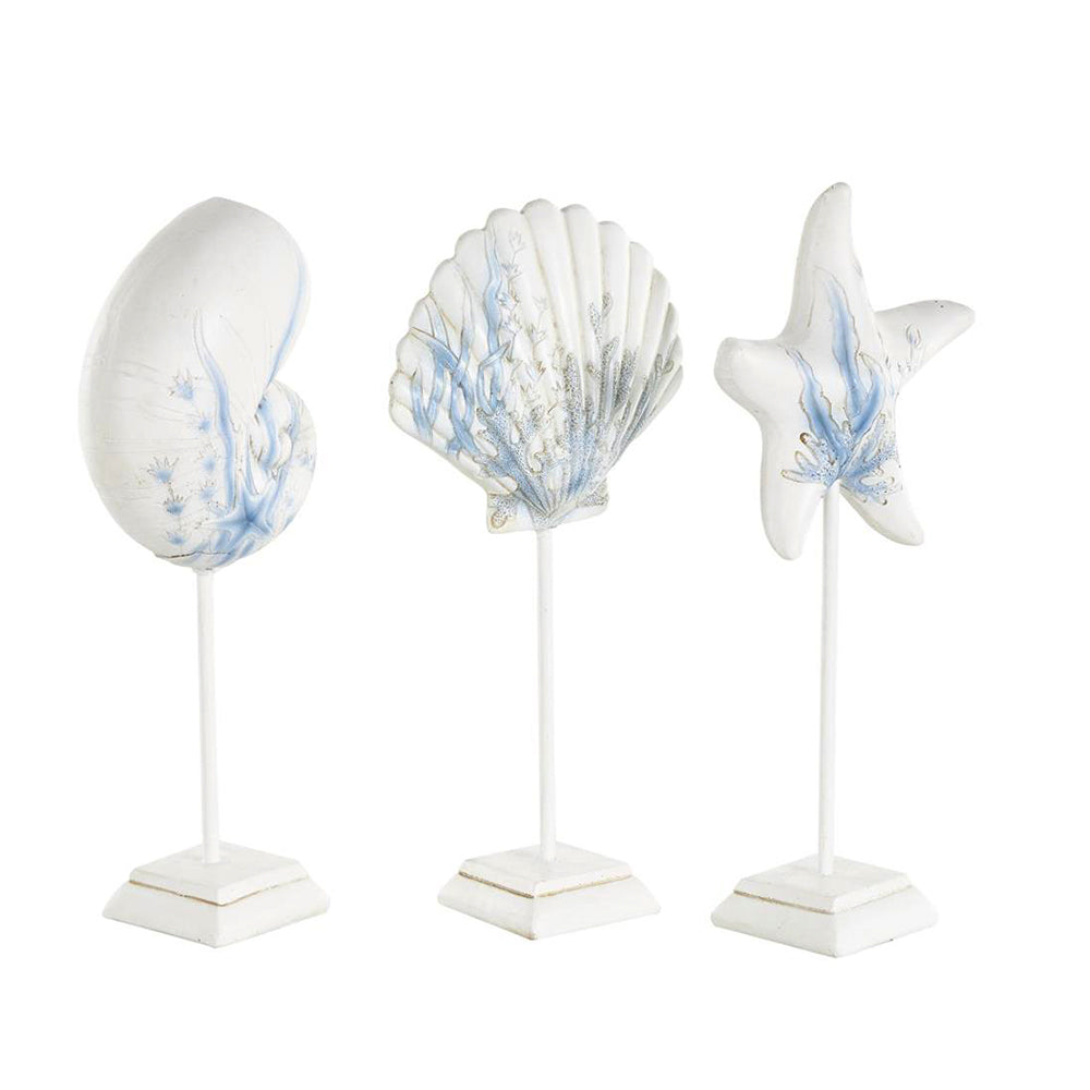 El Set 3 Escultura Vida Marina  captura la esencia del mar con un diseño que combina serenidad, textura y estilo costero refinado. Fabricadas en una mezcla de polipiedra, metal y resina, estas figuras presentan acabados en blanco mate con delicados patrones de coral azul, evocando la pureza de la arena y la calma del océano. Son ideales para añadir un toque natural y relajante a salas, comedores, baños o casas de playa.