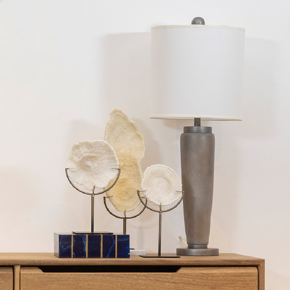 La pantalla cilíndrica en color blanco ártico hecha de tela laminada sobre estireno de la Lámpara Majestic, suaviza la luz y genera una iluminación cálida y uniforme. Su combinación de materiales y colores neutros la hacen versátil y fácil de integrar en estilos modernos, clásicos renovados o minimalistas.