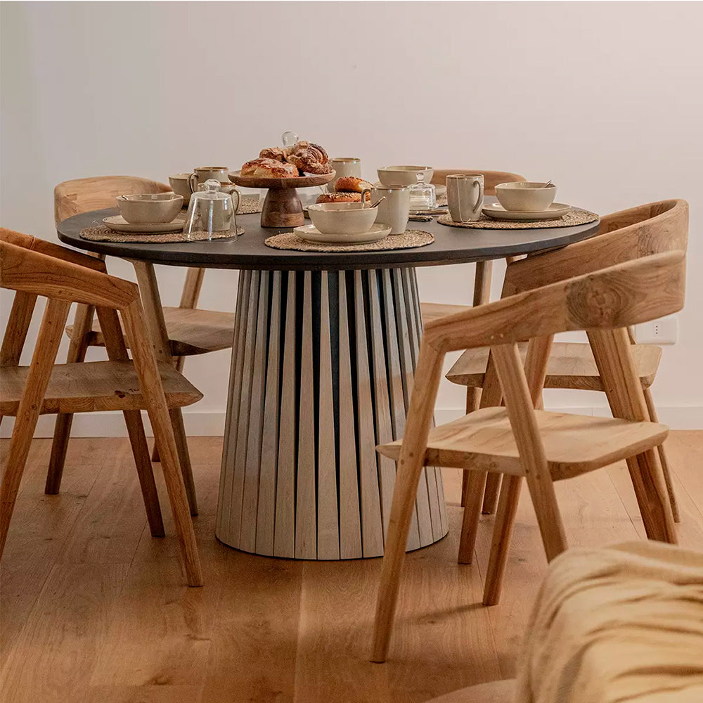 El Comedor Ginner es una pieza imponente que fusiona diseño natural y elegancia atemporal. Su base está elaborada en madera maciza de mango, destacando las vetas orgánicas y los tonos cálidos que hacen de cada mesa un ejemplar único. La tapa, fabricada en mármol negro pulido de 3 cm de grosor, añade un contraste lujoso con sutiles vetas que enriquecen visualmente la superficie.