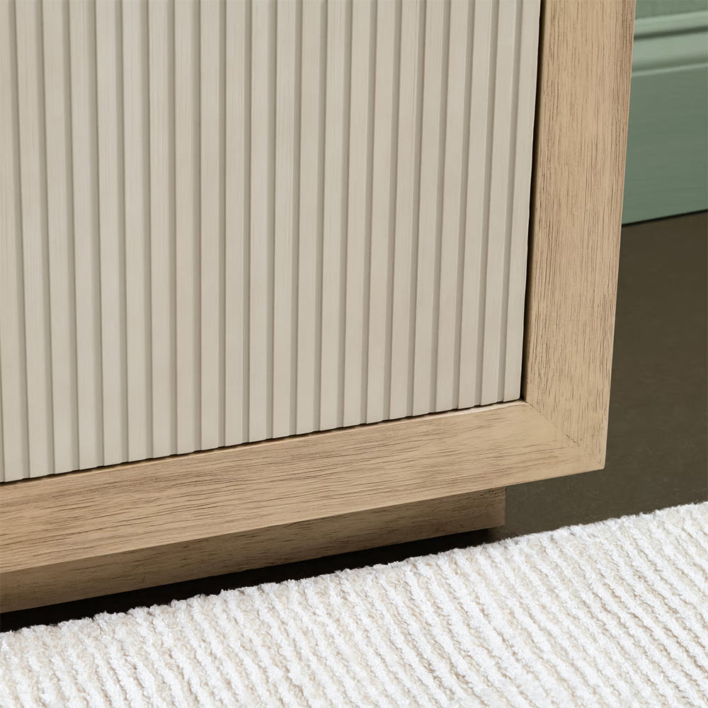 La combinación de madera del Trinchador Haven en tono natural con frentes de líneas verticales y herrajes discretos crea una pieza elegante y versátil que se adapta tanto como aparador decorativo como consola. Su estructura baja y alargada favorece composiciones horizontales, perfecta para muros principales o debajo de obras de arte.