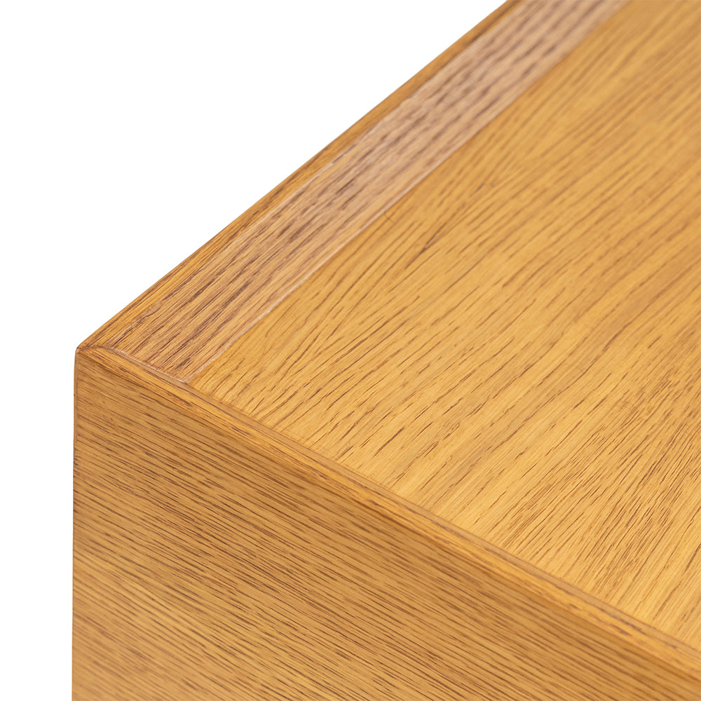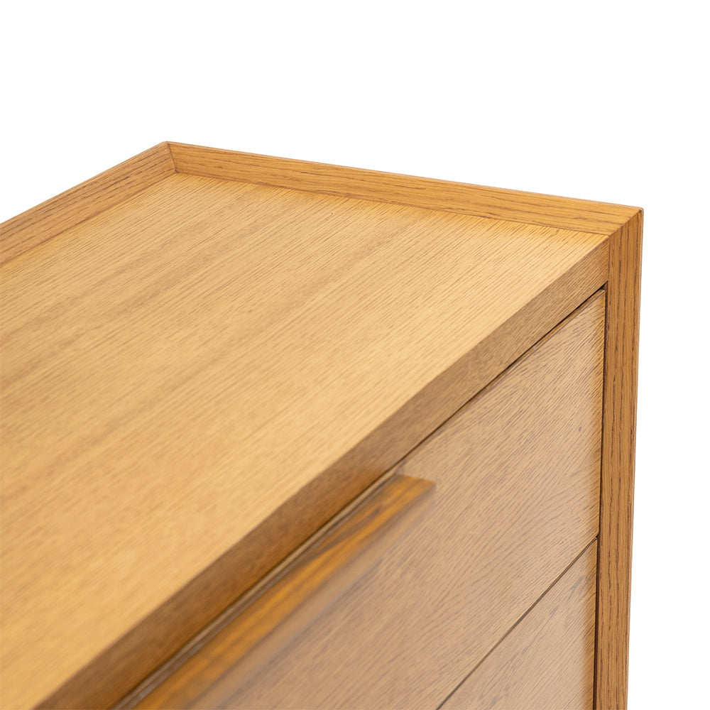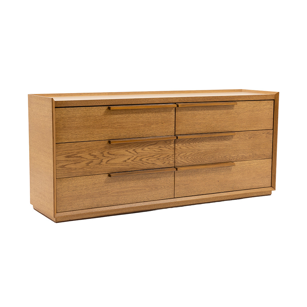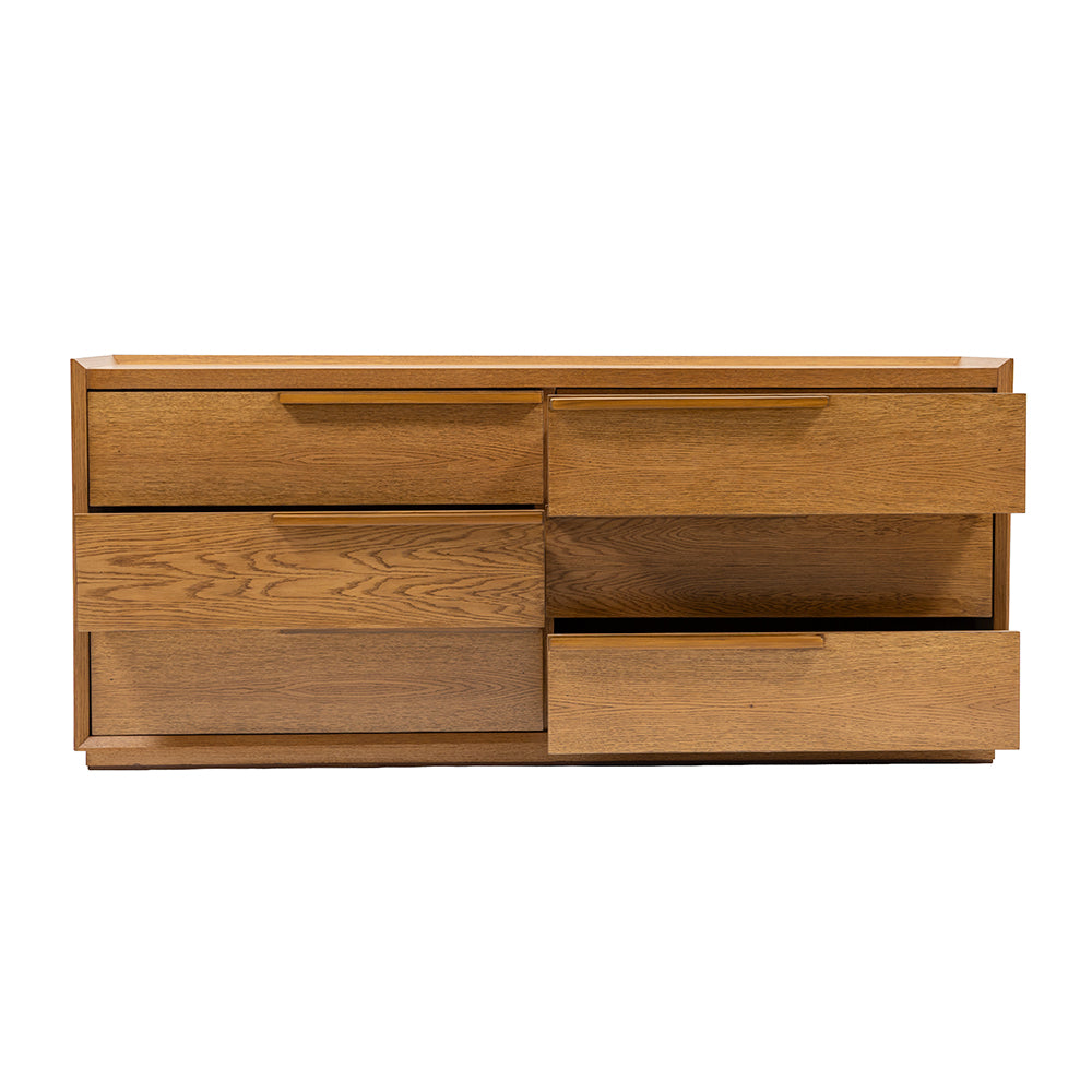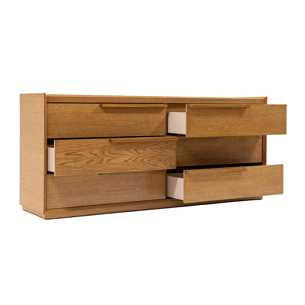 La Cómoda Zamzara destaca por su diseño equilibrado y elegante, su estructura en madera muestra un enmarcado sutil en los bordes que aporta definición sin exageraciones, mientras que sus seis cajones de frente continuo crean una superficie visual uniforme y moderna. Las vetas visibles realzan la calidad de la pieza y le dan un carácter acogedor, perfecto para ambientes contemporáneos o decoraciones más orgánicas.