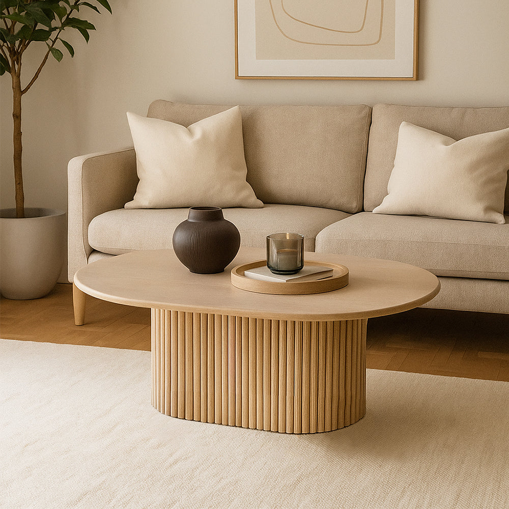 Con una presencia tan serena como poderosa, la Mesa de Centro Keyla transforma cualquier sala en un espacio digno de portada editorial. Su silueta ovalada suaviza visualmente el ambiente, mientras que la base cilíndrica con listones verticales añade textura, ritmo y un aire contemporáneo de inspiración escandinava.