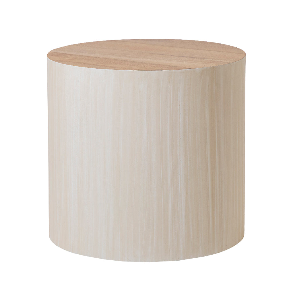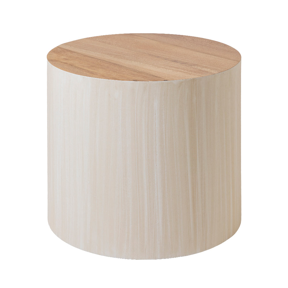 La Mesa Lateral Annika  es una pieza contemporánea de líneas limpias y volumen sólido que aporta equilibrio y sofisticación a cualquier espacio. Su diseño cilíndrico crea una silueta suave y moderna, mientras que la cubierta en madera natural contrasta armoniosamente con la base en acabado claro texturizado, generando una estética cálida y orgánica.