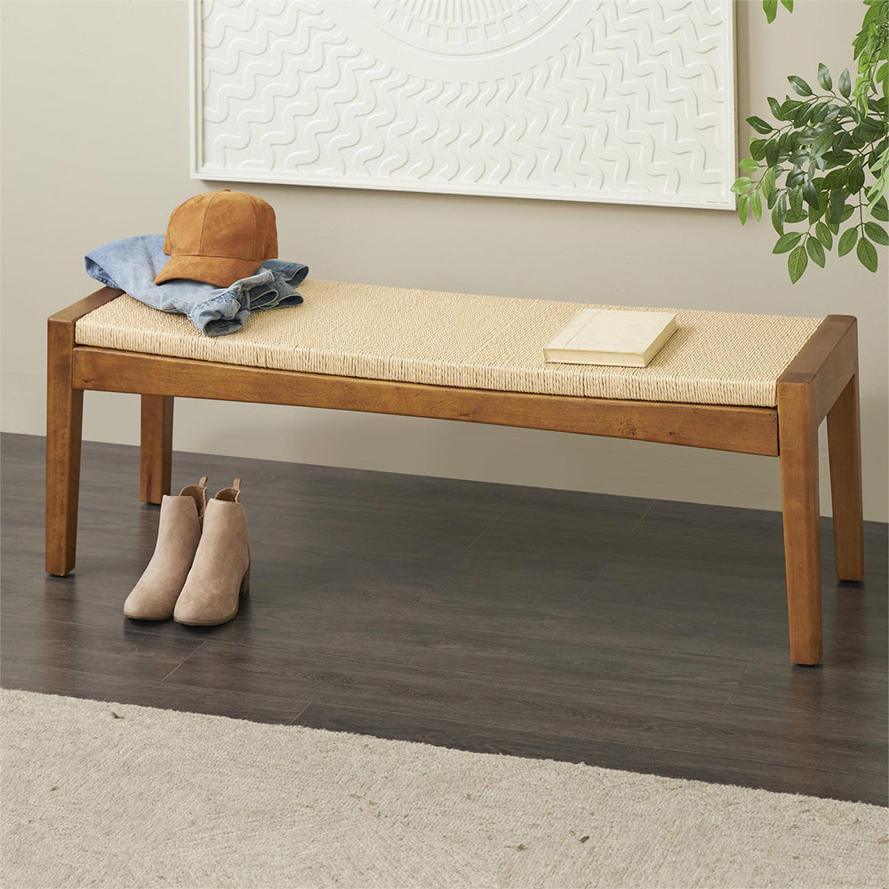 Inspirado en la elegancia clásica y el encanto artesanal, esta Banca Palma combina materiales naturales y acabados cálidos para aportar una sensación de equilibrio y serenidad al hogar. Su estructura robusta de madera de abedul se fusiona con un trenzado de cuerda en tono miel, creando un contraste visual que evoca los interiores de casas de campo modernas y espacios de descanso con alma vintage.