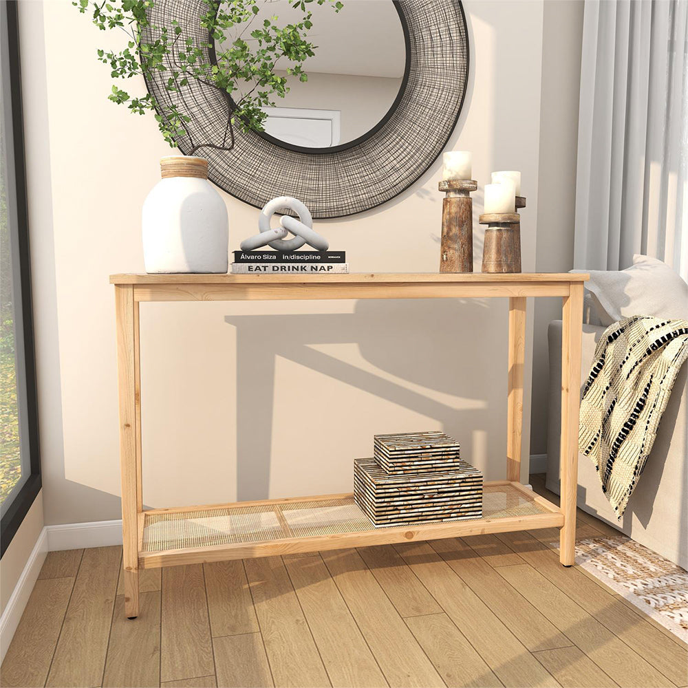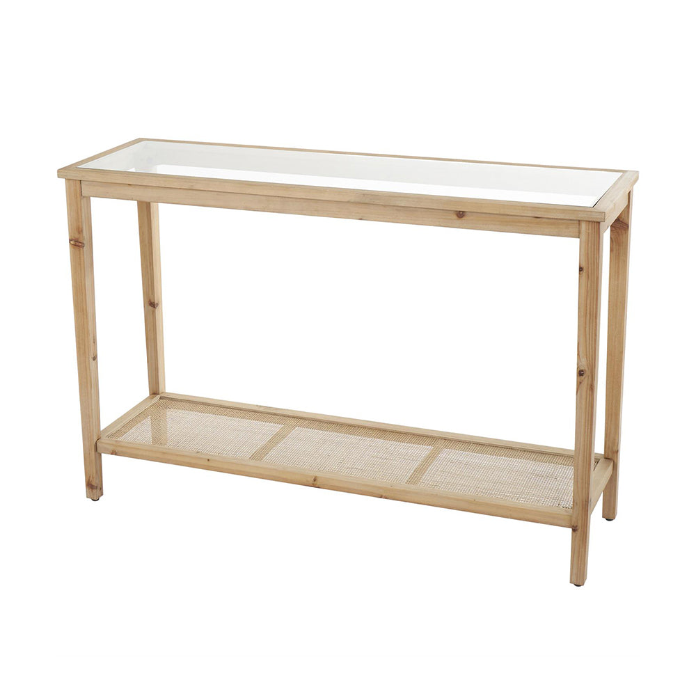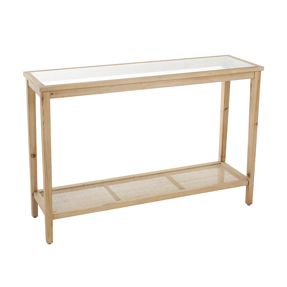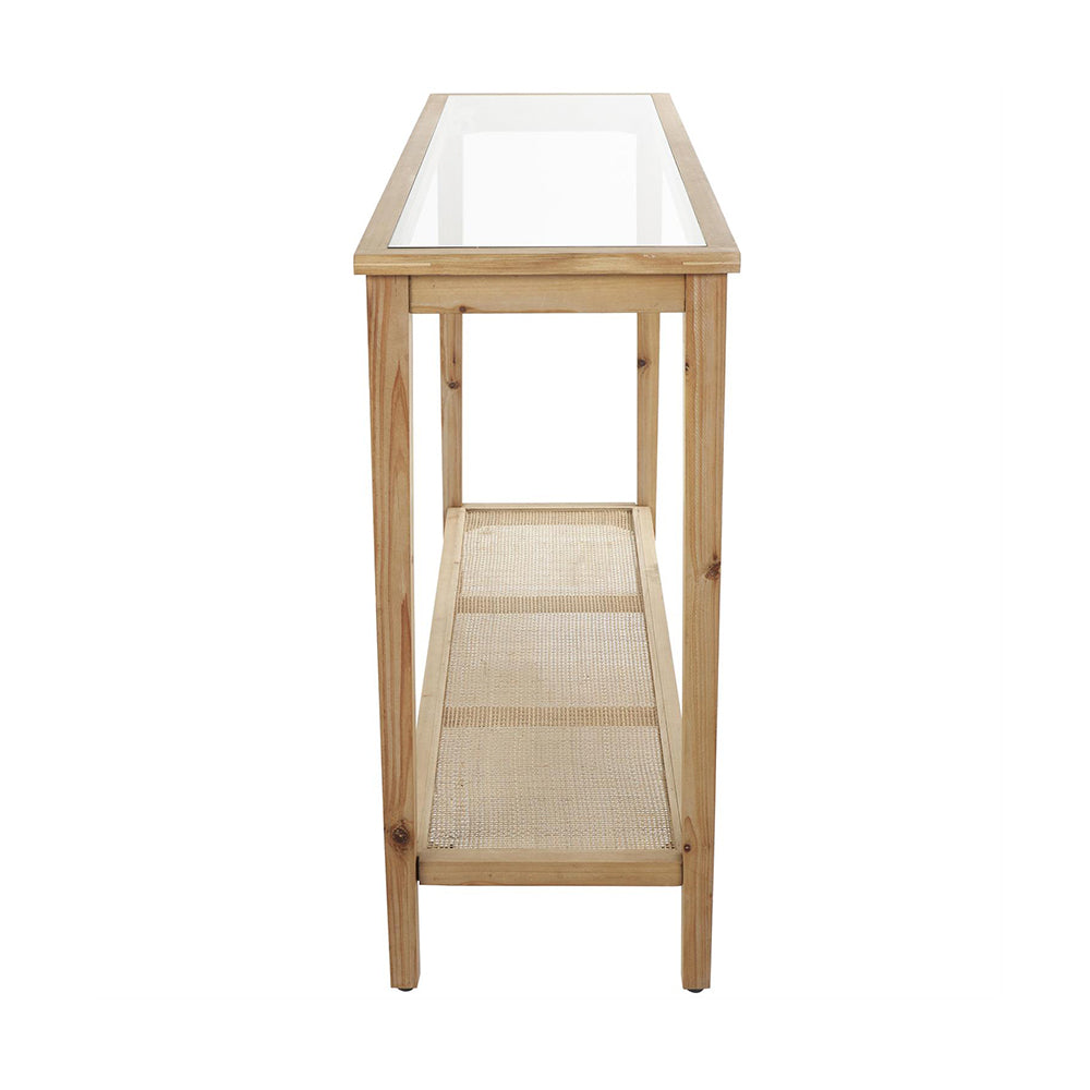 Con un aire contemporáneo y refinado, esta Consola Vetra combina líneas limpias y materiales naturales para crear una pieza tan funcional como elegante. Su estructura de madera con acabado marrón aceitado se complementa con un estante inferior de ratán trenzado y una cubierta de vidrio transparente que aporta ligereza visual. El resultado es un equilibrio perfecto entre calidez orgánica y modernidad.