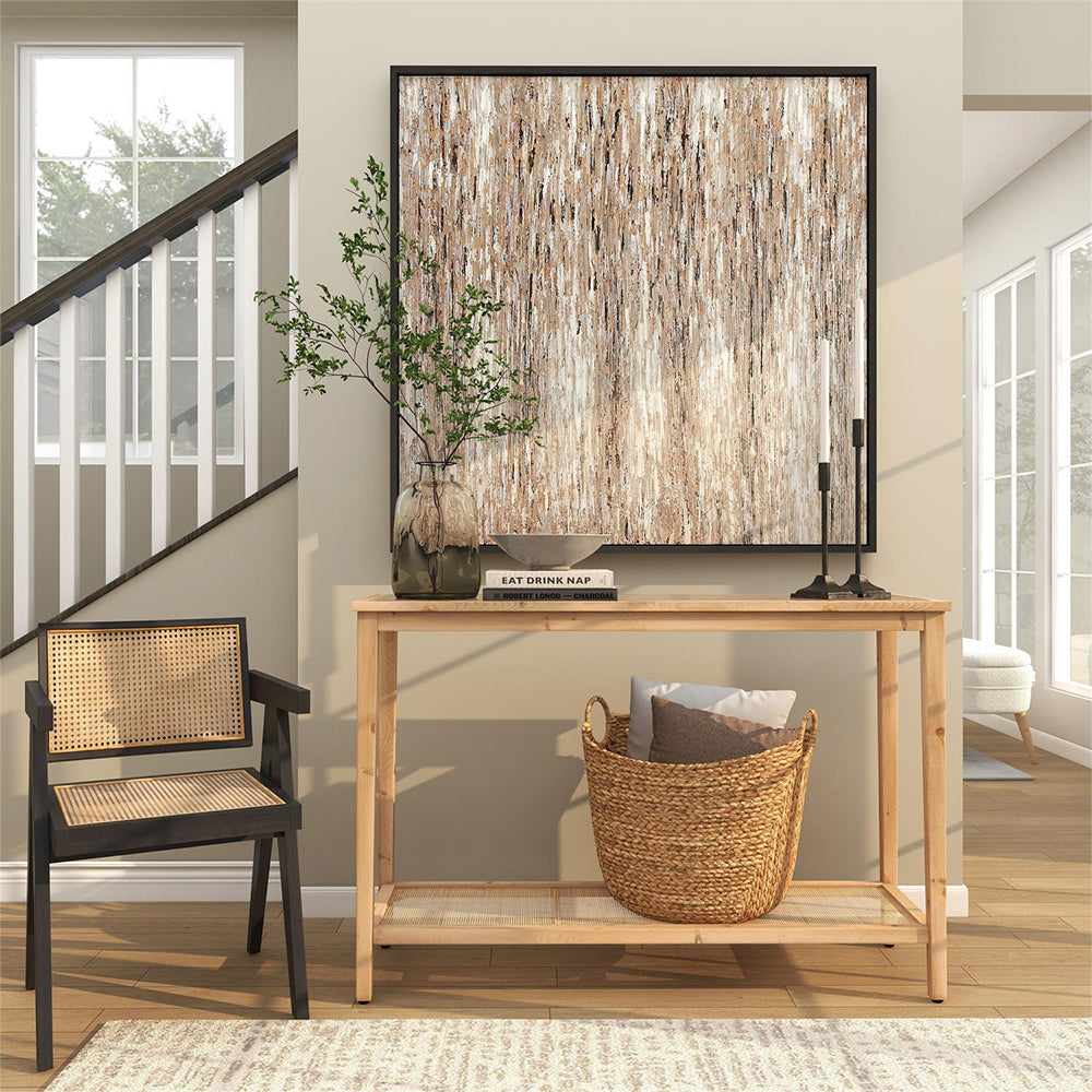 Ideal para entradas, salas o comedores, su diseño rectangular de la Consola Vetra ofrece una superficie amplia y una base texturizada que aporta dimensión al espacio. La mezcla de madera, vidrio y fibras naturales la convierte en un mueble versátil que se adapta tanto a interiores minimalistas como a estilos más cálidos y naturales.