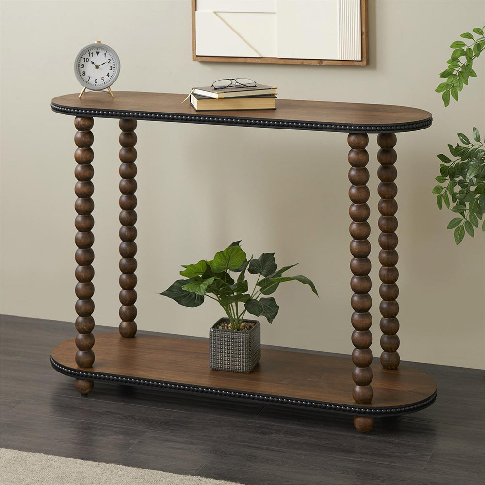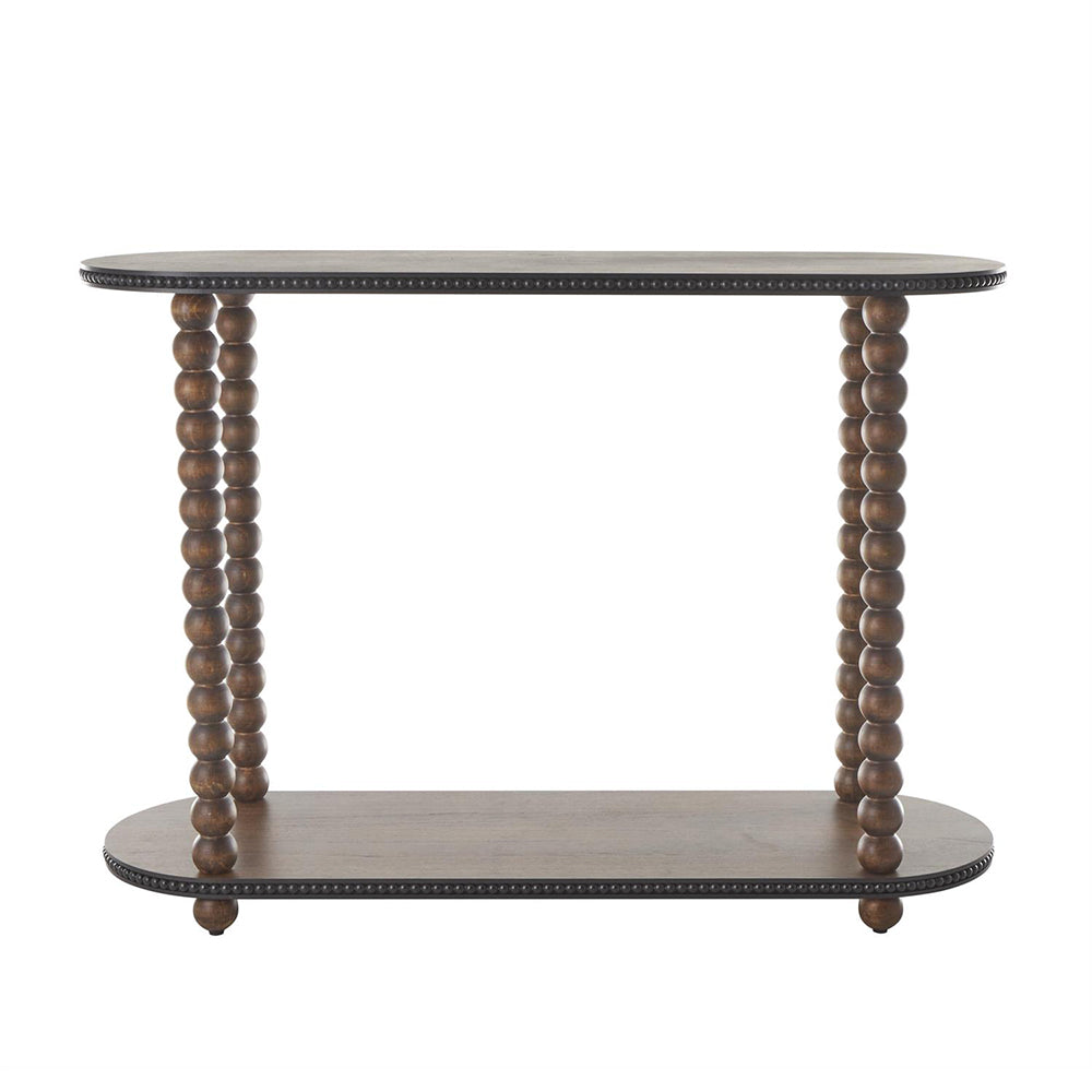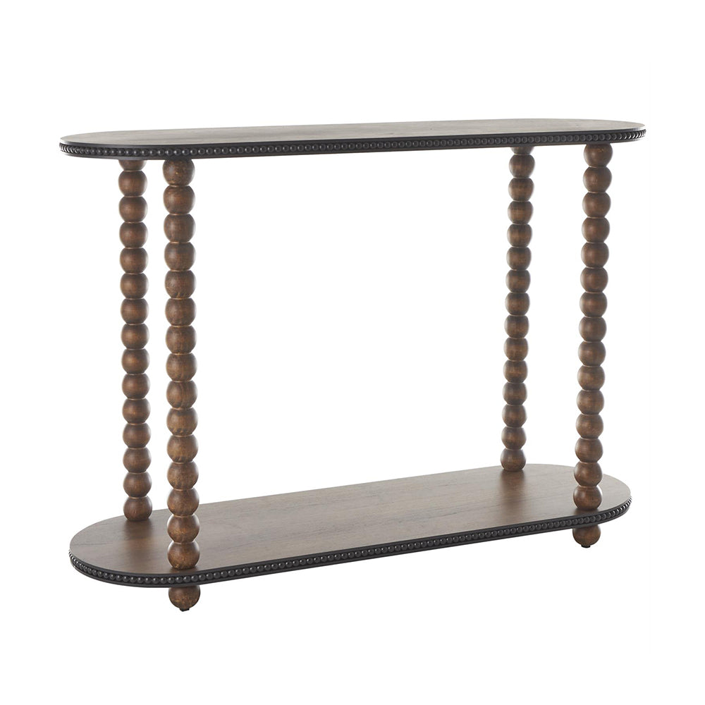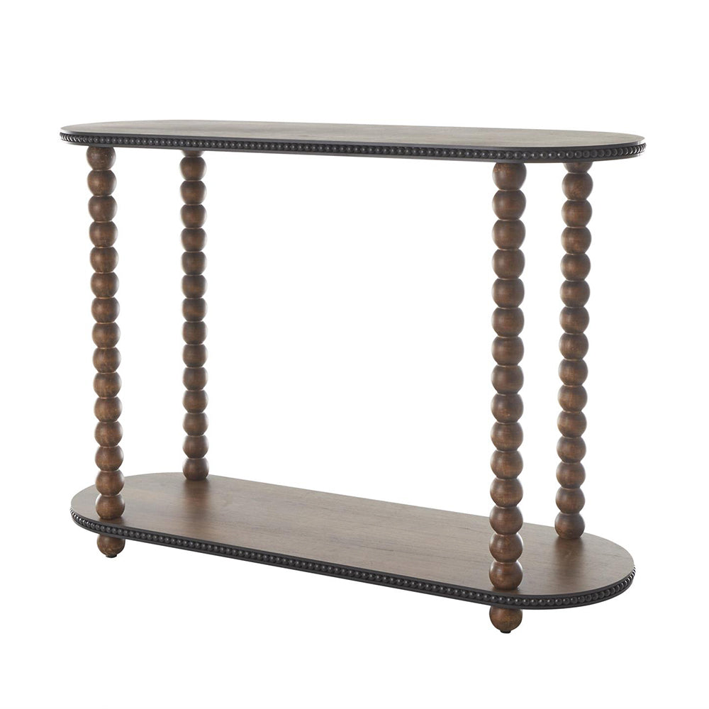 Su estructura ovalada se sostiene sobre patas torneadas con delicados detalles en cuentas, mientras que el estante inferior añade funcionalidad sin sacrificar estilo. Cada Consola Madison está cuidadosamente tallada y aceitada para realzar la textura y durabilidad de la madera, logrando un diseño que evoca refinamiento y tradición con un toque artesanal.