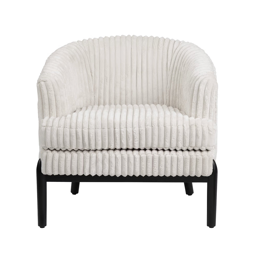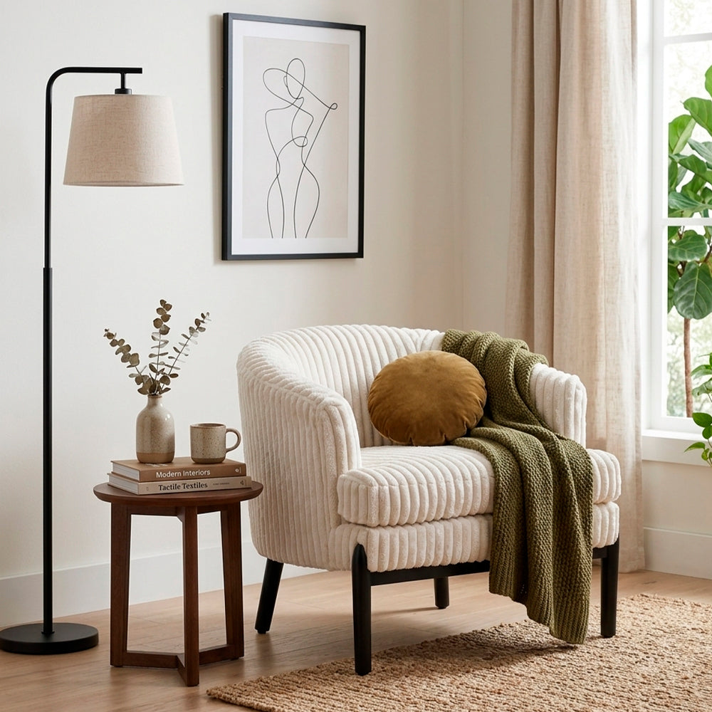 Este Sillón Marfil presenta un diseño escultural de líneas limpias que aporta una sensación de elegancia contemporánea y calidez visual a cualquier espacio. Su silueta tipo barril envuelve el asiento, creando una pieza ideal para salas, recámaras o rincones de lectura donde se busca confort sin sacrificar estilo.