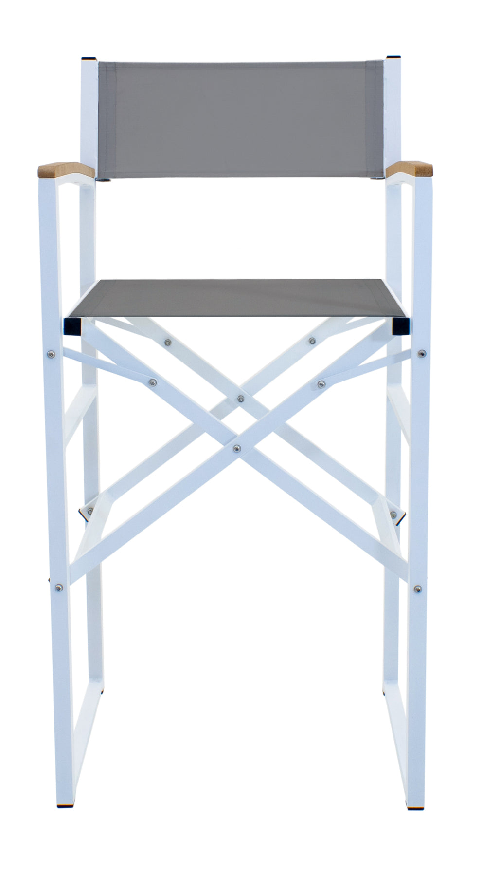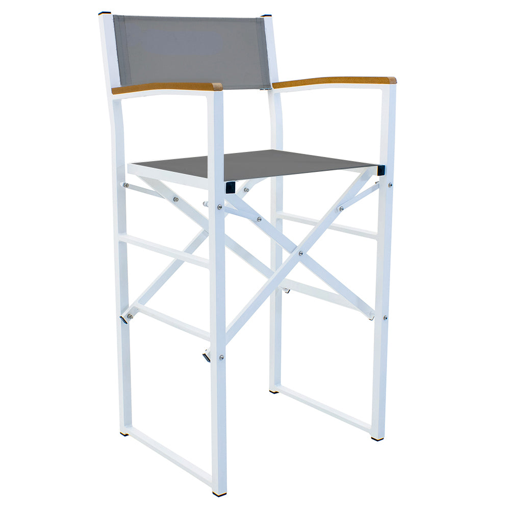 - Material: Estructura de aluminio entintado en color blanco, plegable, brazos con polímero imitación madera con protector de rayos UV, asiento y respaldo de malla de textileno gris.