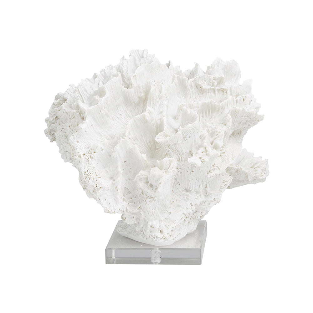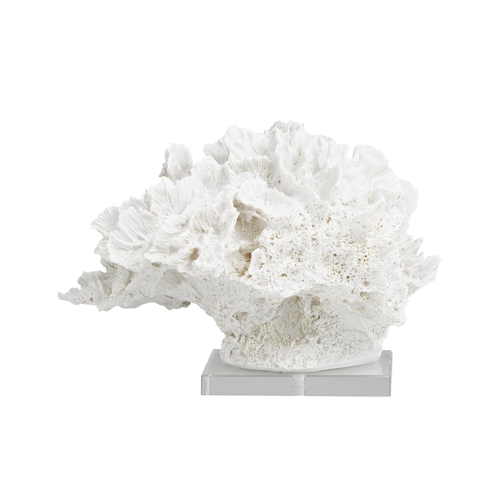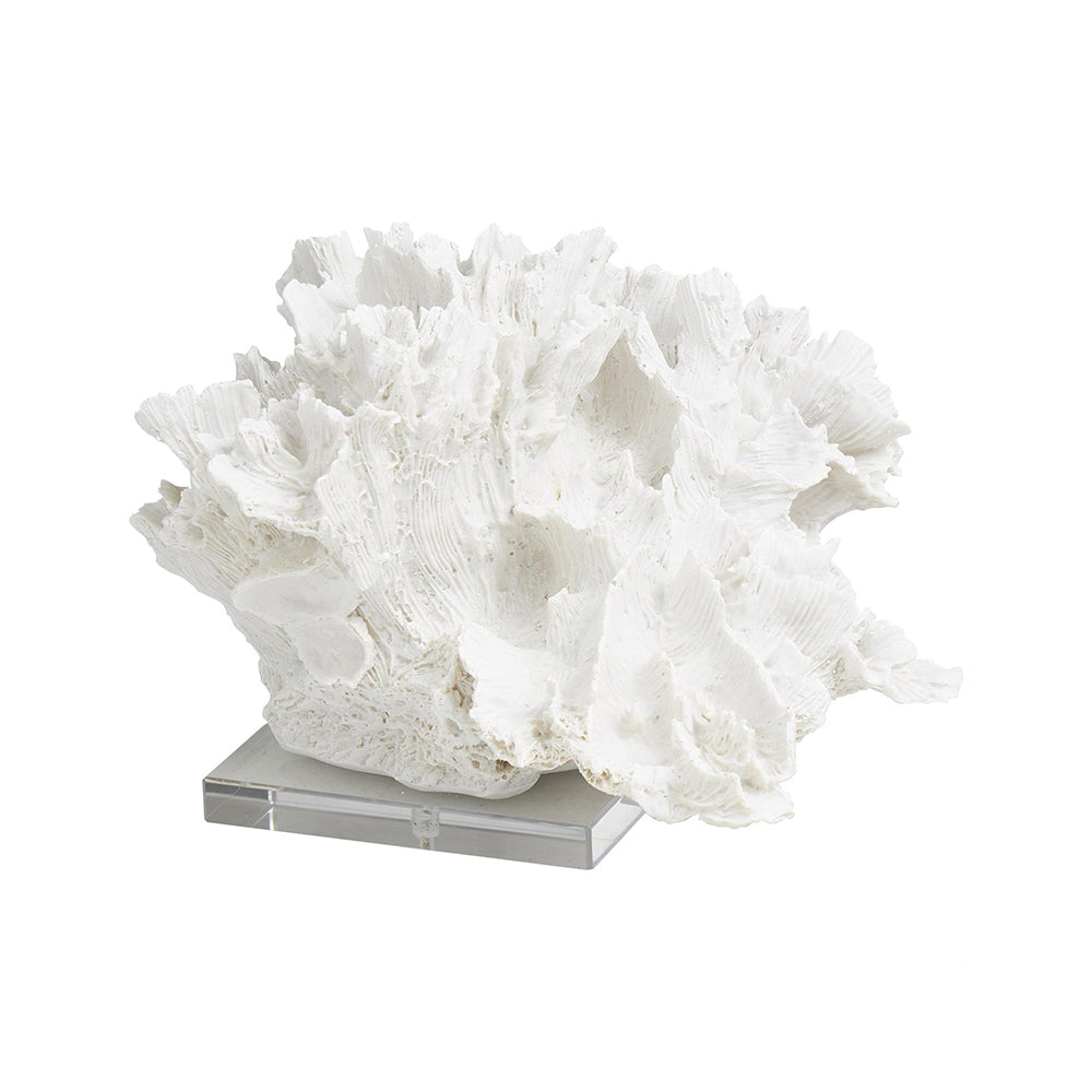Su diseño realista de coral crea una composición natural que evoca la belleza del entorno marino. La base de acrílico eleva la pieza, generando un efecto visual moderno y elegante que funciona como un punto focal sofisticado.
