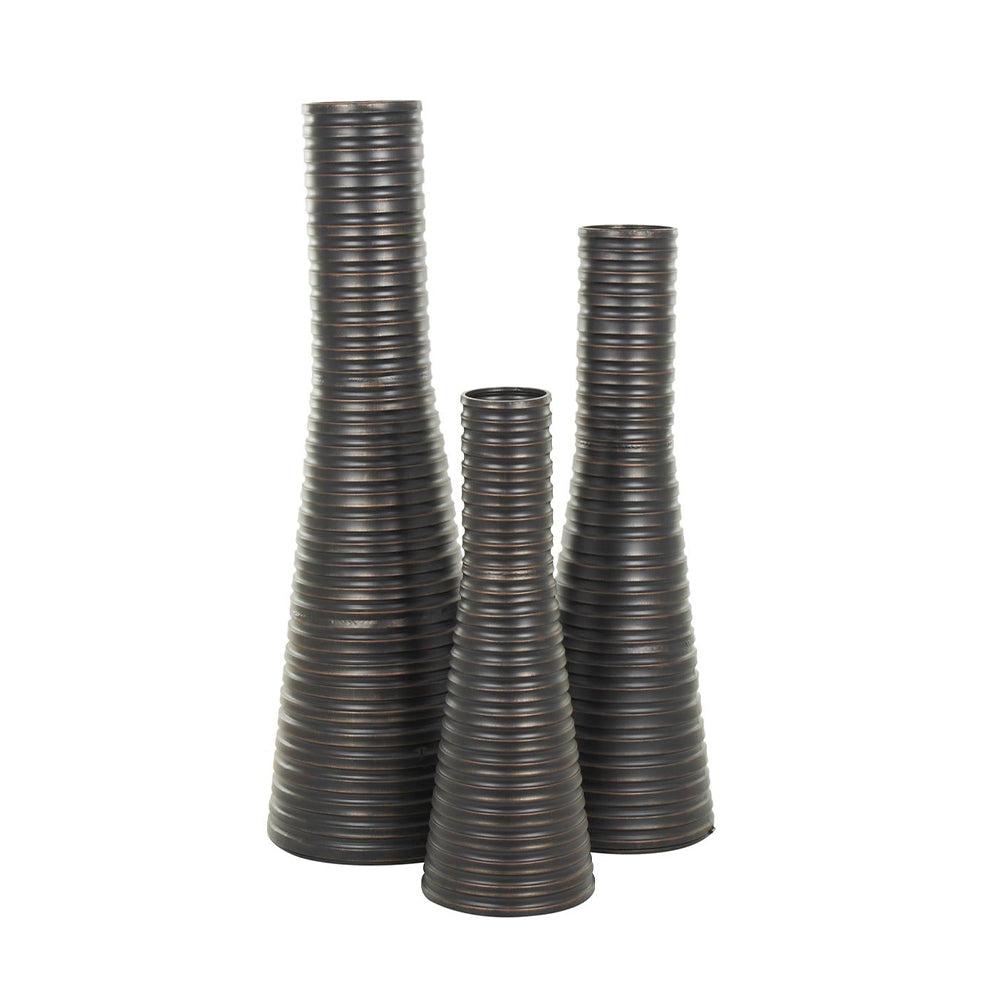 Fabricados en hierro de alta calidad, estos jarrones decorativos combinan durabilidad con una estética refinada. Su acabado en bronce mate aporta profundidad y calidez, ideal para integrarse en salas, recibidores o espacios de acento dentro de proyectos de interiorismo.