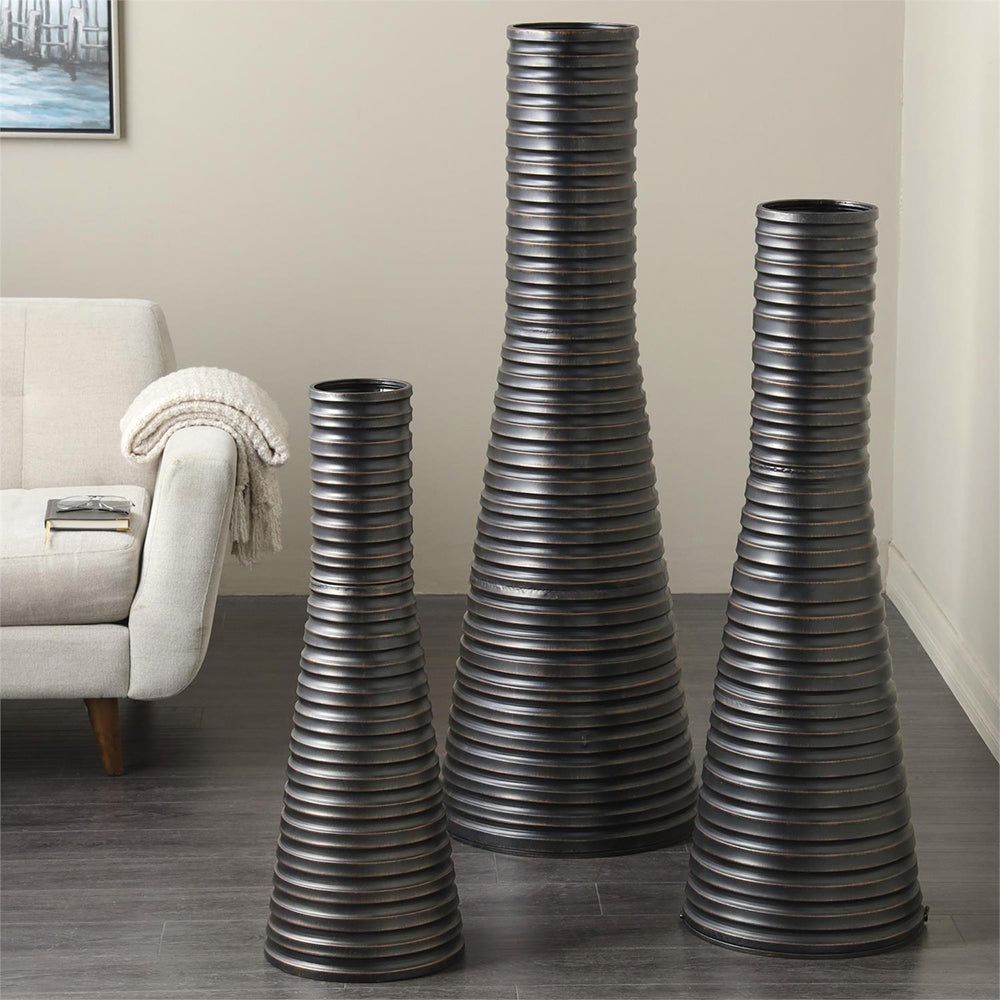 Su diseño cónico con detalles acanalados y ranuras horizontales crea una composición visual dinámica que añade textura y ritmo. Las diferentes alturas permiten generar un efecto escalonado que funciona como un punto focal imponente, perfecto para flores de tallo largo o como piezas escultóricas por sí solas.