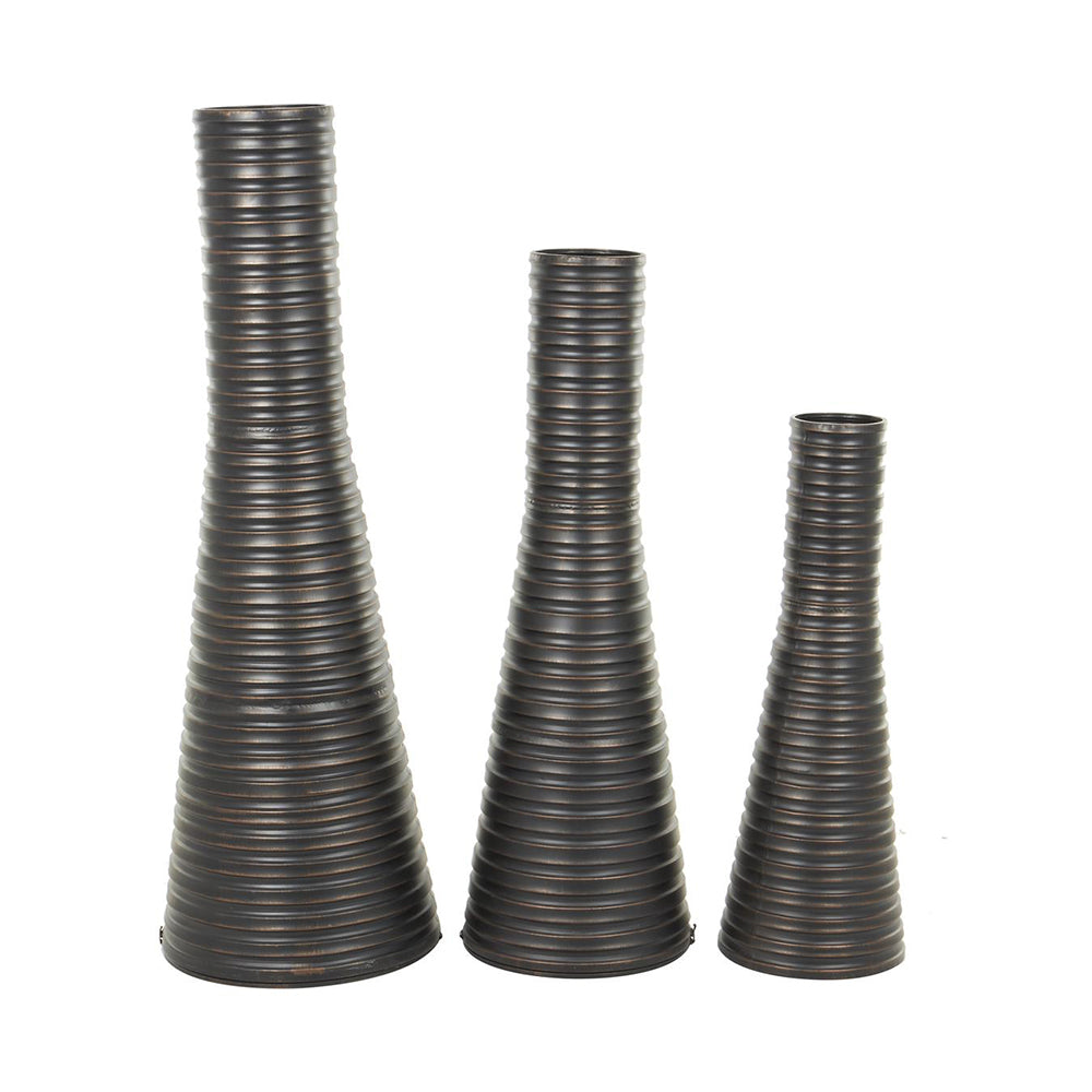 Inspirado en la elegancia minimalista y las líneas arquitectónicas, el Set de 3 Jarrones Decorativos Cónicos en Hierro Acabado Bronce Mate aporta altura, sofisticación y carácter a cualquier espacio. Su diseño estilizado y monocromático los convierte en piezas ideales para interiores modernos, contemporáneos o de estilo elegante.
